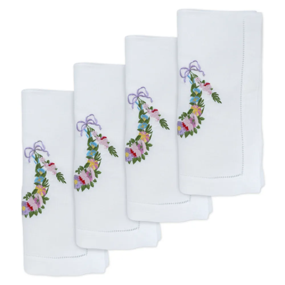 Set of 4. Mixed threads embroidered on 100% white linen. Hemstitch border.