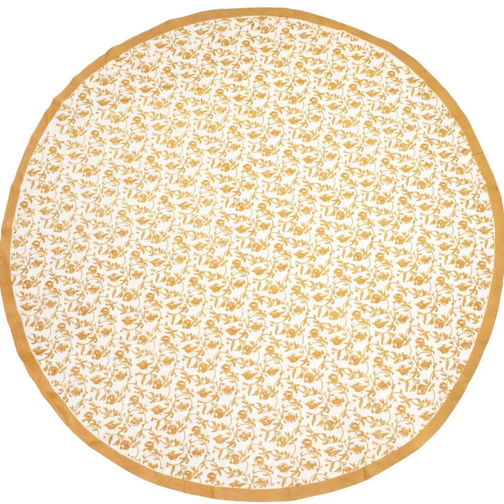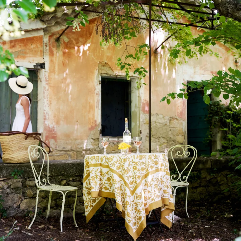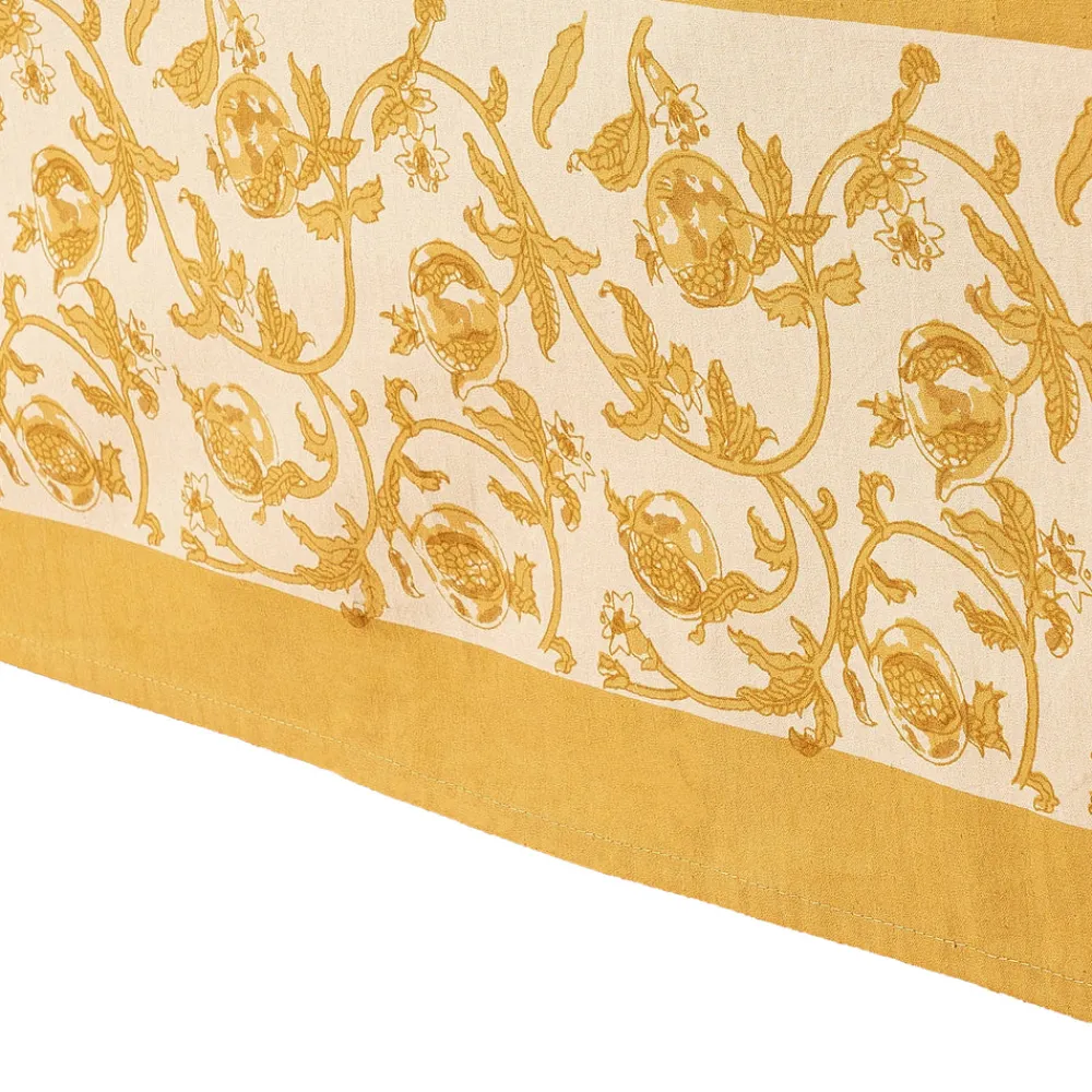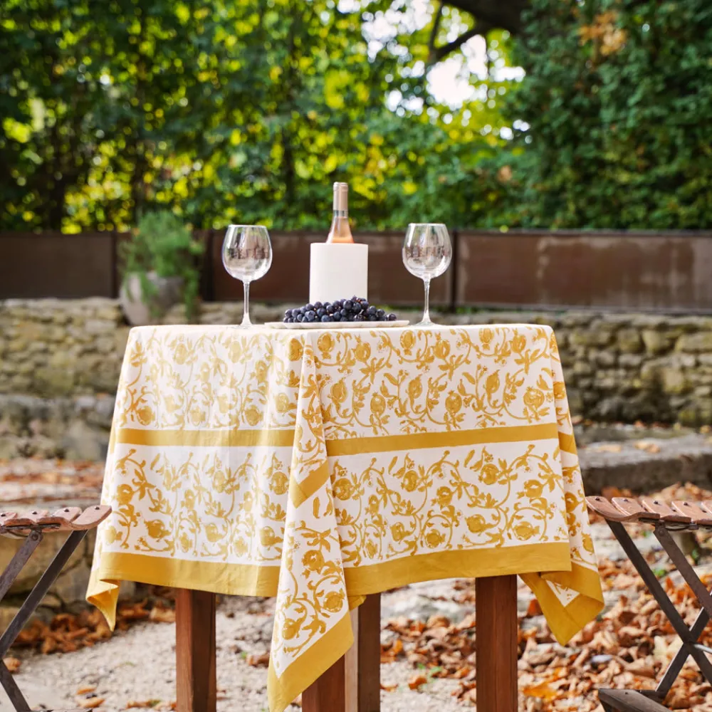 Idyllic landscapes, sumptuous colors, and the vibrant beauty of Southern France describes Couleur Nature. This brand of hand-painted table linens aims to bring a Provençal sense of effortlessness, rich culture, and joie de vivre to your life and home—no matter where you live. The French Tablecloth Granada in Mustard features a delicately Intertwined floral pattern with mustard pomegranates atop a white background. Creating a tranquil mood, this high-quality piece is a must-have for dine-in memories. An elegant addition to any tablescape.
