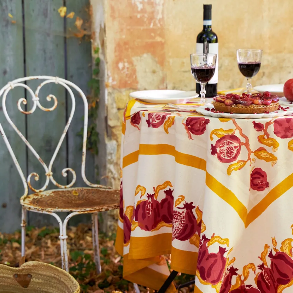 Idyllic landscapes, sumptuous colors, and the vibrant beauty of Southern France describes Couleur Nature. This brand of hand-painted table linens aims to bring a Provençal sense of effortlessness, rich culture, and joie de vivre to your life and home—no matter where you live. The French Tablecloth Pomegranate ruby red tones and bright, citrine yellows. Designed in a lively pattern that brightens up any space, this high-quality piece is a must-have for dine-in memories. An elegant addition to any tablescape.