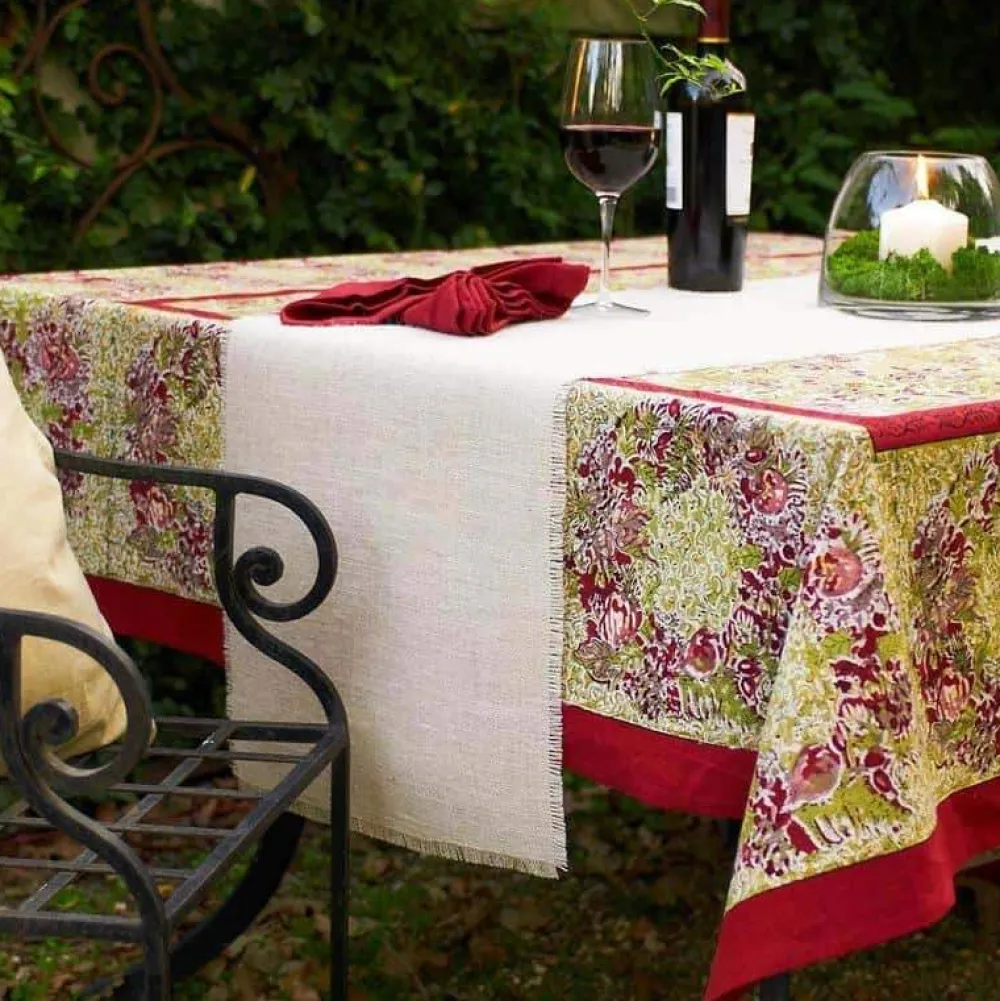 Idyllic landscapes, sumptuous colors, and the vibrant beauty of Southern France describes Couleur Nature. This brand of hand-painted table linens aims to bring a Provençal sense of effortlessness, rich culture, and joie de vivre to your life and home—no matter where you live. The French Tablecloth Winter Garden Wreath in Red and Green features a rustic design and evocative colors that create a seasonal comfort to your table. Especially suitable for holidays, this high-quality piece is a must-have for dine-in memories. An elegant addition to any tablescape.