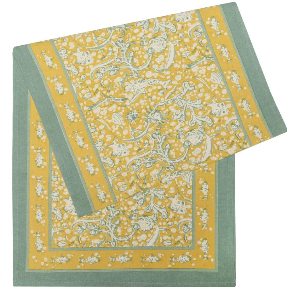 Idyllic landscapes, sumptuous colors, and the vibrant beauty of Southern France describes Couleur Nature. This brand of hand-painted table linens aims to bring a Provençal sense of effortlessness, rich culture, and joie de vivre to your life and home—no matter where you live. The La Mer Runner Aqua & Citrine features a pattern bursting with rich, seaside-inspired colors. Delightful and bold, this runner creates a beautiful landscape for all of your delicacies. An elegant addition to any tablescape.