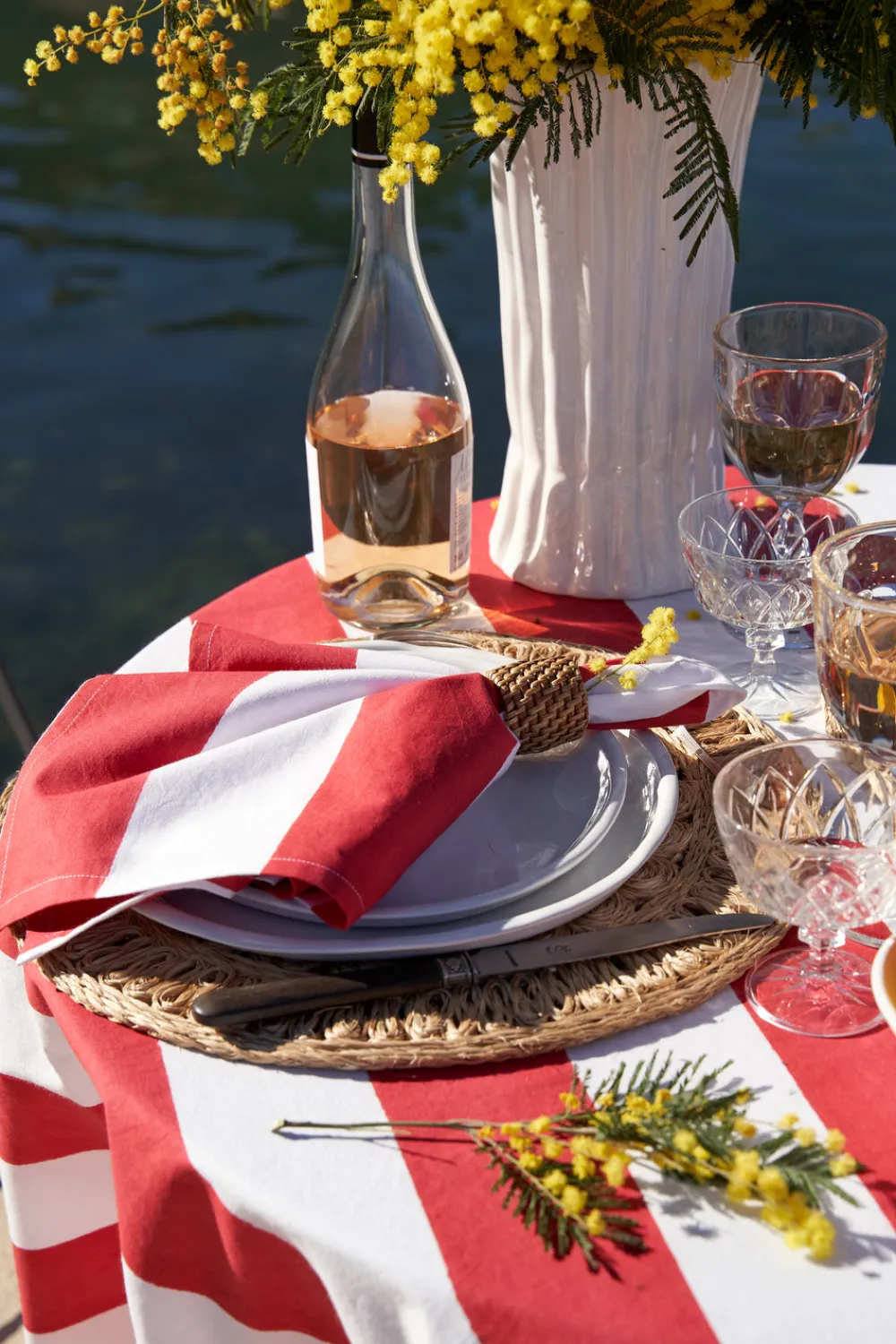 Idyllic landscapes, sumptuous colors, and the vibrant beauty of Southern France describes Couleur Nature. This brand of hand-painted table linens aims to bring a Provençal sense of effortlessness, rich culture, and joie de vivre to your life and home—no matter where you live. Add a touch of effortless French elegance to every meal with the St. Tropez Napkins in Red, Set of 6. Crafted from a heavyweight linen and cotton blend, these napkins feature a wide cabana stripe design that beautifully complements formal, festive, and casual events alike.