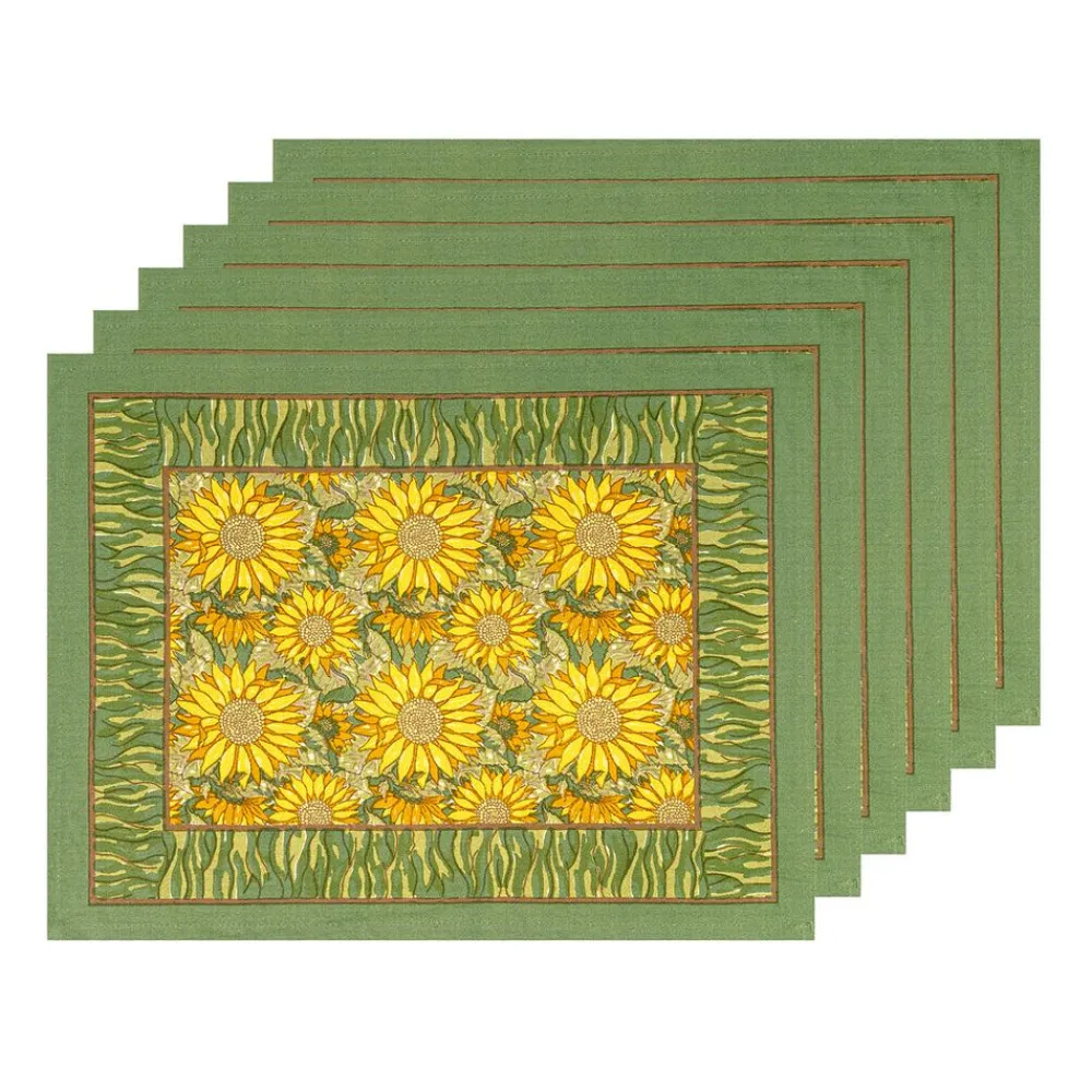 Idyllic landscapes, sumptuous colors, and the vibrant beauty of Southern France describes Couleur Nature. This brand of hand-painted table linens aims to bring a Provençal sense of effortlessness, rich culture, and joie de vivre to your life and home—no matter where you live. With its rich sage and Provencal mustards, the Sunflower Mats in Yellow & Green, Set of 6 dazzles on any table. Add a bit of the French Countryside to your home with this fine linen collection. Fine French table linens, hand-printed, these table placemats are a great way to refresh your table, adding color and vibrancy to every day or formal settings.