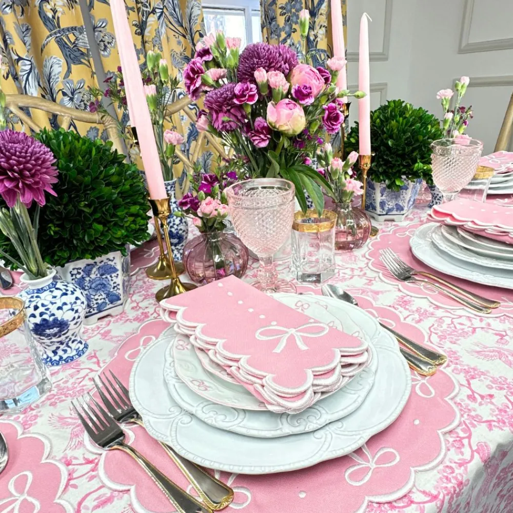 Swiss linen, fine cotton, and tasteful refinement define Flying Sheep Country’s linens and tabletop items. Founded by two sisters who spent their youth spotting sheep in the English countryside, the brand celebrates both luxury and whimsy in its vibrant prints, fine embroidery, and traditional artisanship. All about bows. Get tablescape ready with the Juliet Bows Napkin in Pink, Set of 4. Ideally elegant for celebratory occasions and wonderful dinner parties.