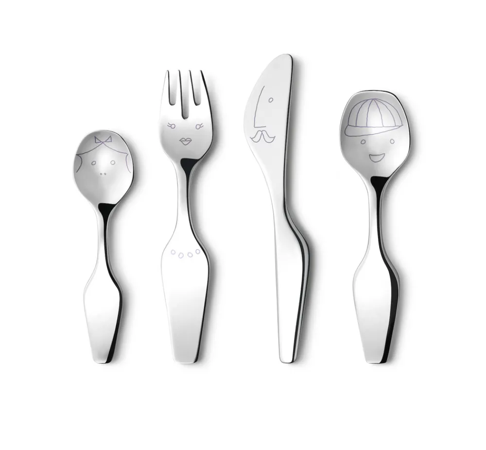 For over a century, Georg Jensen has developed jewelry, silverware, and home decor with purposeful, timeless, and functional beauty in mind. Rooted in Scandinavia, and inspired by the lines of Art Nouveau, the brand innovates, sustainable, unmistakable design with a distinctive vigor and unmatched quality. Designer Alfredo Häberli worked with Georg Jensen to create a range of kitchen and dining room products that import not only functionality but light-hearted personality. Hand-drawn designs staring up at diners from the The Alfredo 4 Piece Twist Family Cutlery Set, SS add a sense of fun to any meal.