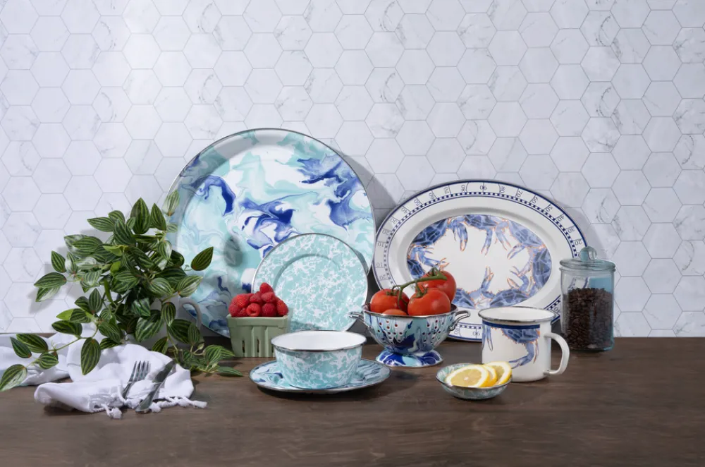 Blue Crab 12 x 16 inch Oval Platter ¥ Oven & Stovetop Safe ¥ Hardened Enamel Surface ¥ Dishwasher Safe ¥ Non-ToxicThis enamelware is made of carbon steel coated with a porcelain enamel and trimmed in stainless steel. There will be variations in the shading of colors and pattern formations which are the results of the hand-dipped process.These enamelware pieces add the perfect dash of style and sophistication to your meals. YouÕll be sure to excite appetites and eyes with our selection of enamelware pails, stock pots, platters and more. As always, these pieces are built to maintain their artistic appeal and function for many years to come.Ê