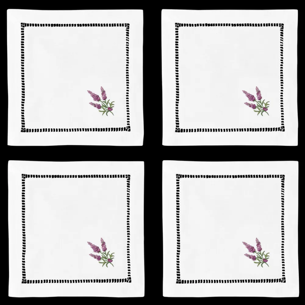 Set of 4. 100% cotton. Imported. Comes in a cello package, tied with a white satin ribbon.