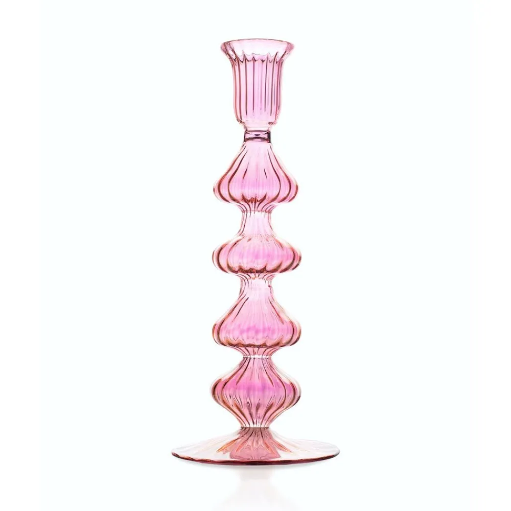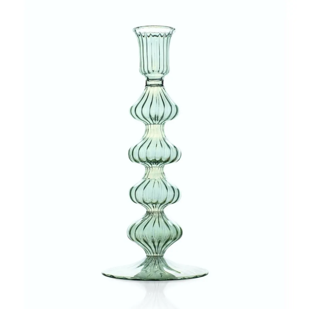 Designed by Issy Granger and crafted by artisans in Cairo, the Buto Candlestick features lightweight borosilicate glass with a dazzling green or pink hue. Handmade without a mold, each piece is beautifully one-of-a-kind.