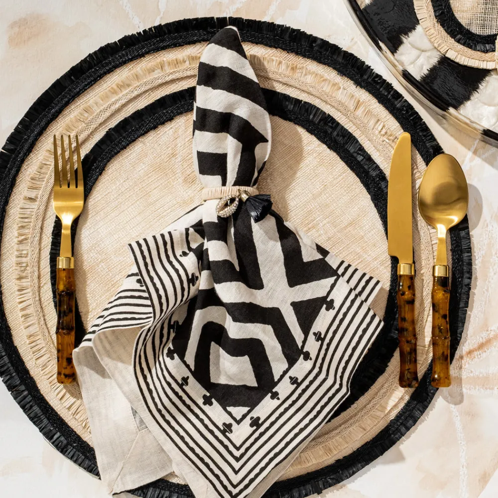 Inspired by her mother’s flare for holiday decorating, Joanna Buchanan has turned her love of travel and knowledge gleaned from twenty years in fashion retail into an eclectic line of tabletop, barware, gifts, and decor. Handcrafted in abaca, the Ruffle Edge Straw Placemat in Black, Set of Four adds subtle whimsy to your table.