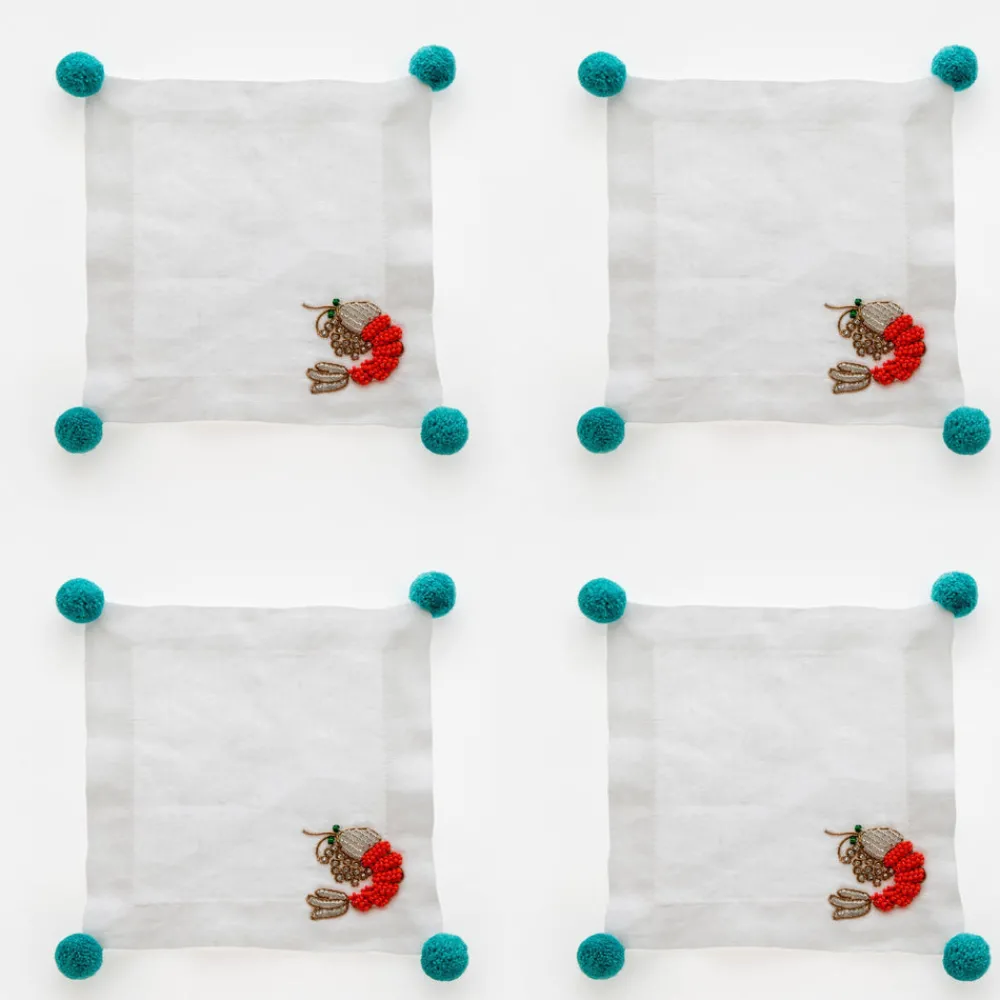 Inspired by her mother’s flare for holiday decorating, Joanna Buchanan has turned her love of travel and knowledge gleaned from twenty years in fashion retail into an eclectic line of tabletop, barware, gifts, and decor. Embroidered with coral beads and turquoise pompoms, the Shrimp Cocktail Napkins bring an amusing and playful touch to the tablescape.