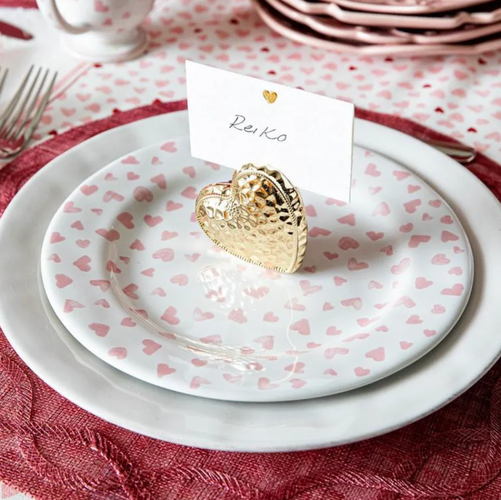 As newlyweds and self-proclaimed romantics, Capucine and David Gooding founded Juliska in 2001 with a small collection of mouth-blown Bohemian glasses. Add a gleaming accent (with a romantic design and hammered finish to the dining table with the Berry & Thread Heart Place Card Holder, Set of 4 in Gold. Make your diners feel special all year round.