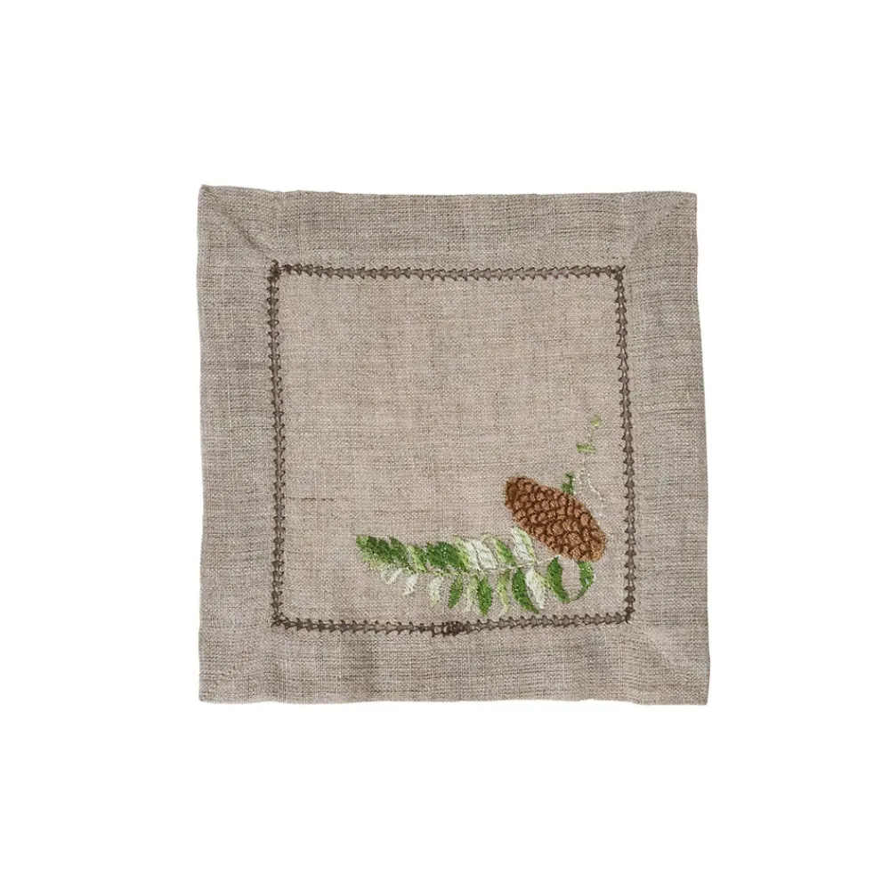 Set of four cocktail napkins. 100% linen. Hand-embroidered with woodland motifs. From Juliska’s Forest Walk Collection.