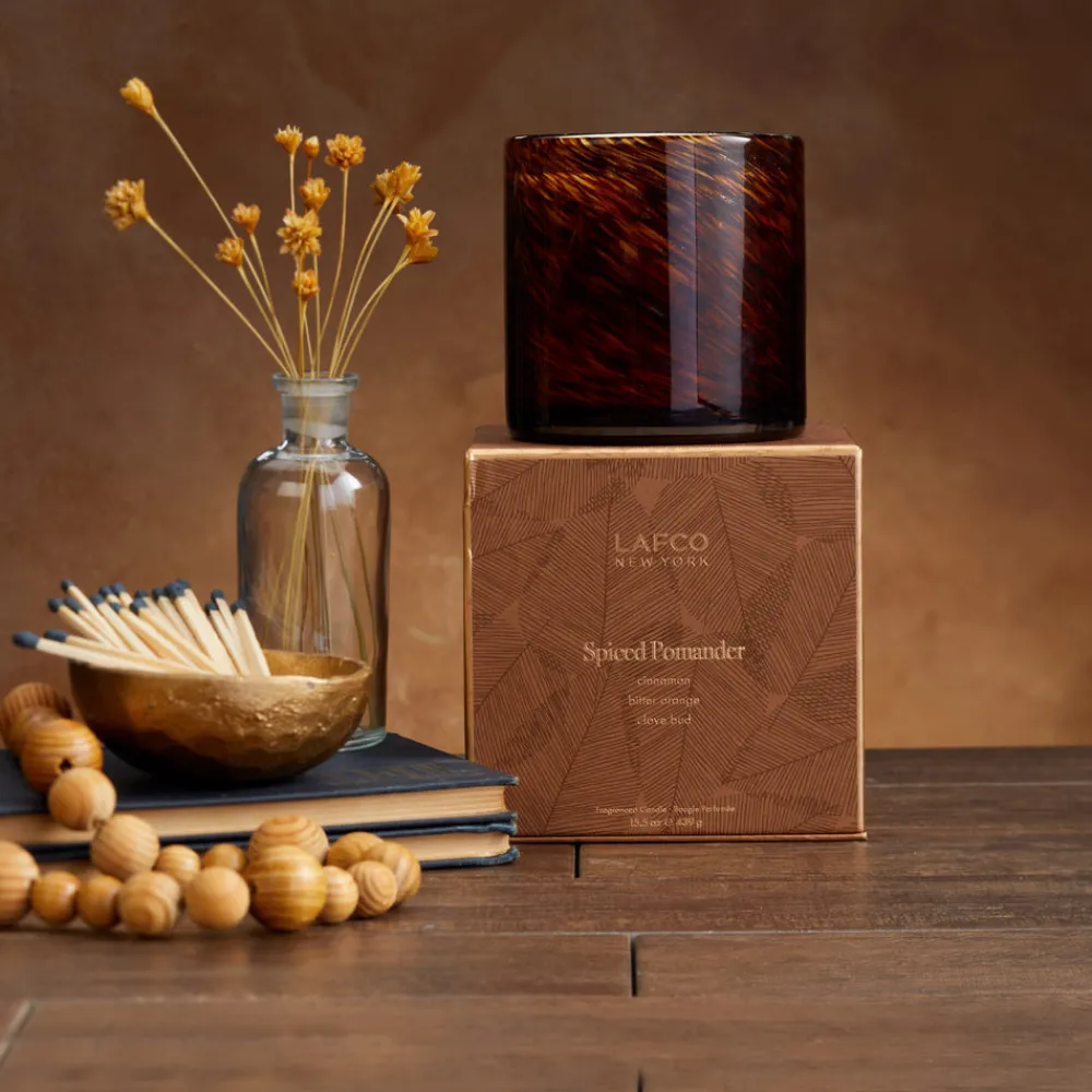 LAFCO (Luxury Articles and Fragrance Company) New York transforms everyday moments into powerful sensory journeys. Established in 1992 by world-renowned nose Jon Bresler, LAFCO transports his passion for the European tradition of botanical based fragrances to specialty candles, home goods, and uniquely formulated personal care products. Encased in hand-blown glass, the Spiced Pomander Signature Candle is a modern twist on a classic fall aroma. A mix of bright bitter orange, sweet apricot, and zesty ginger is decorated with clove buds and nestled within the warm richness of fresh cinnamon. This inviting fragrance lets you know the holidays are near.