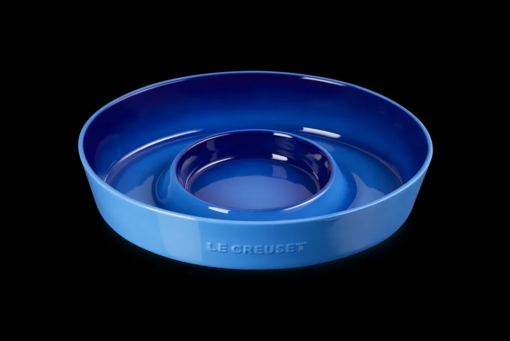 Crafted from premium stoneware for excellent heat retention and uniform temperature. Finished with a vibrant, non-porous glaze that resists scratches, stains, and flavor absorption. Center dip bowl holds sauces, garnishes, or a Mini Cocotte; wide outer section accommodates a variety of snacks or serving arrangements. Designed to seamlessly blend elegance with everyday utility.