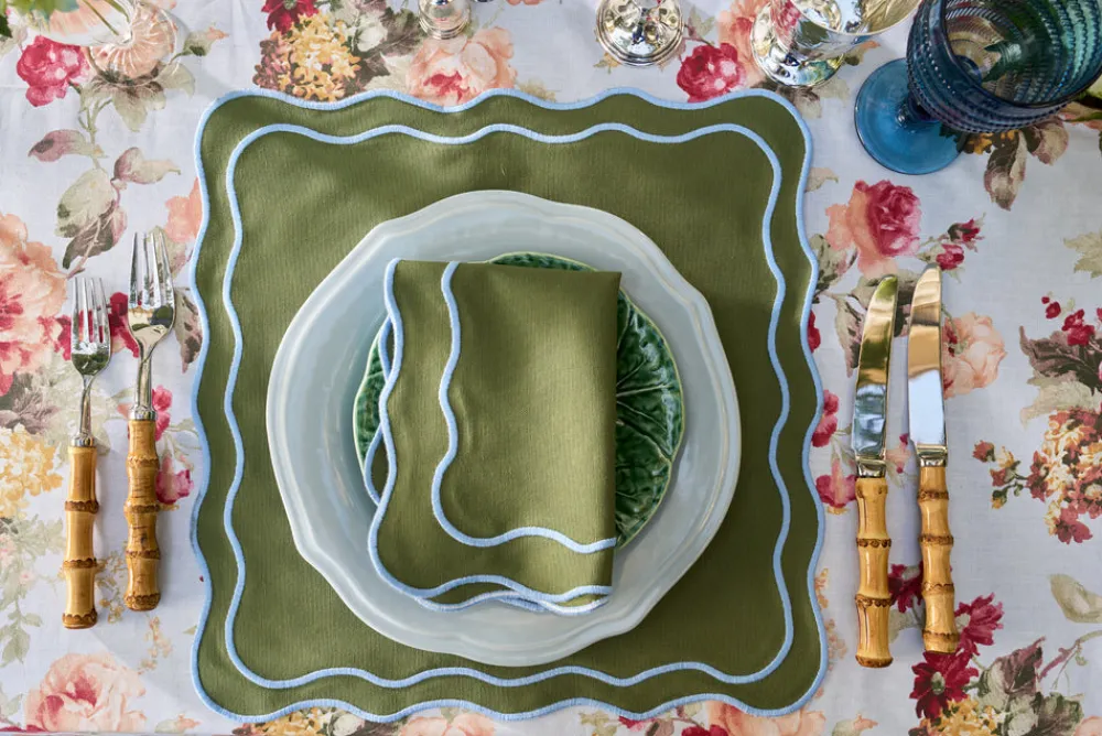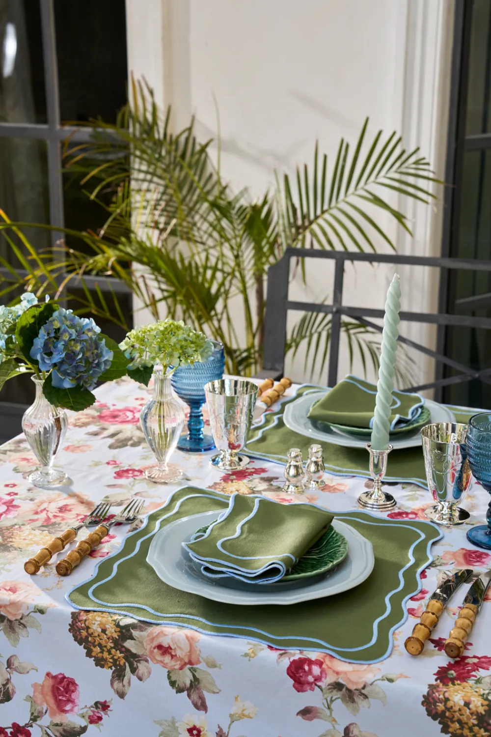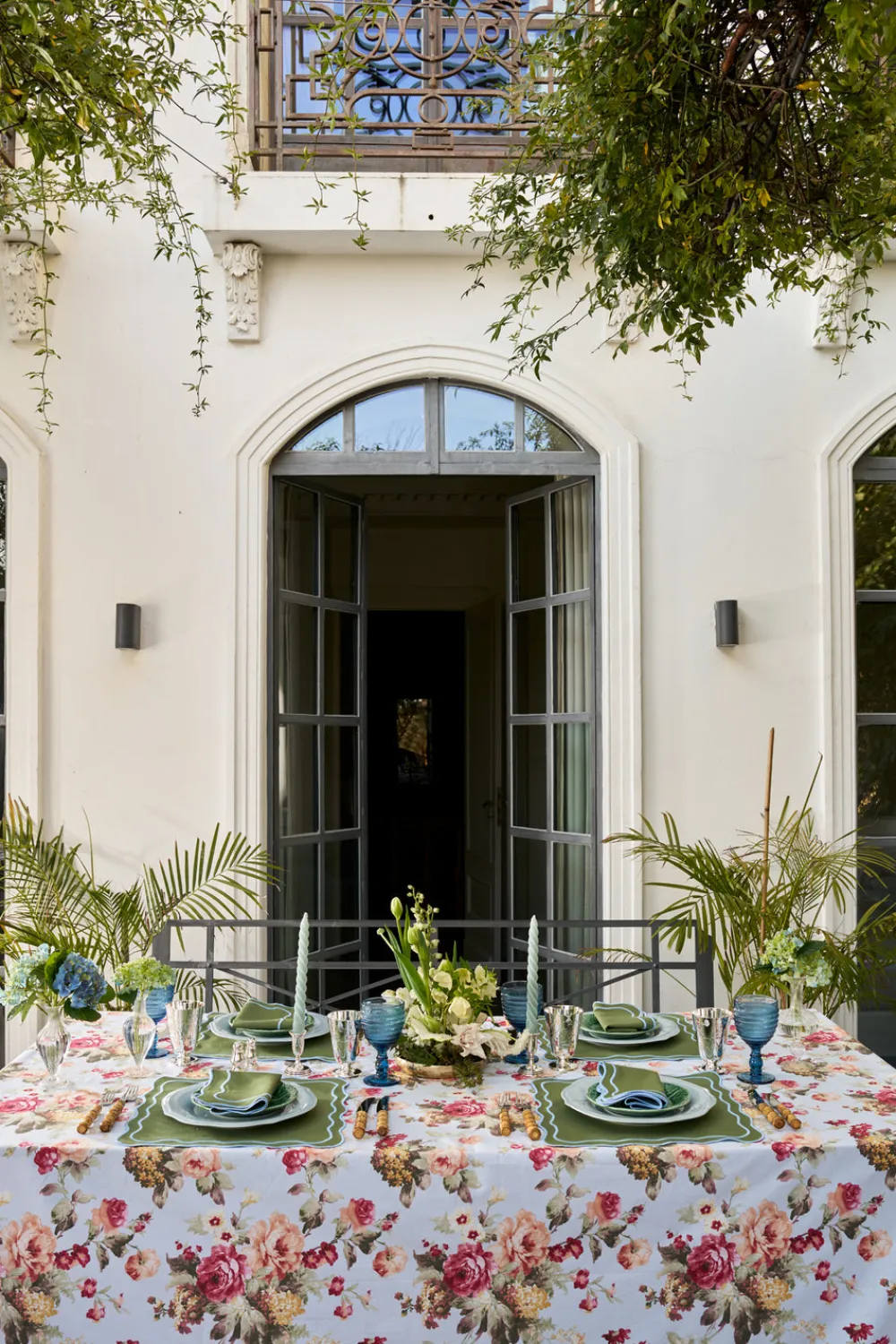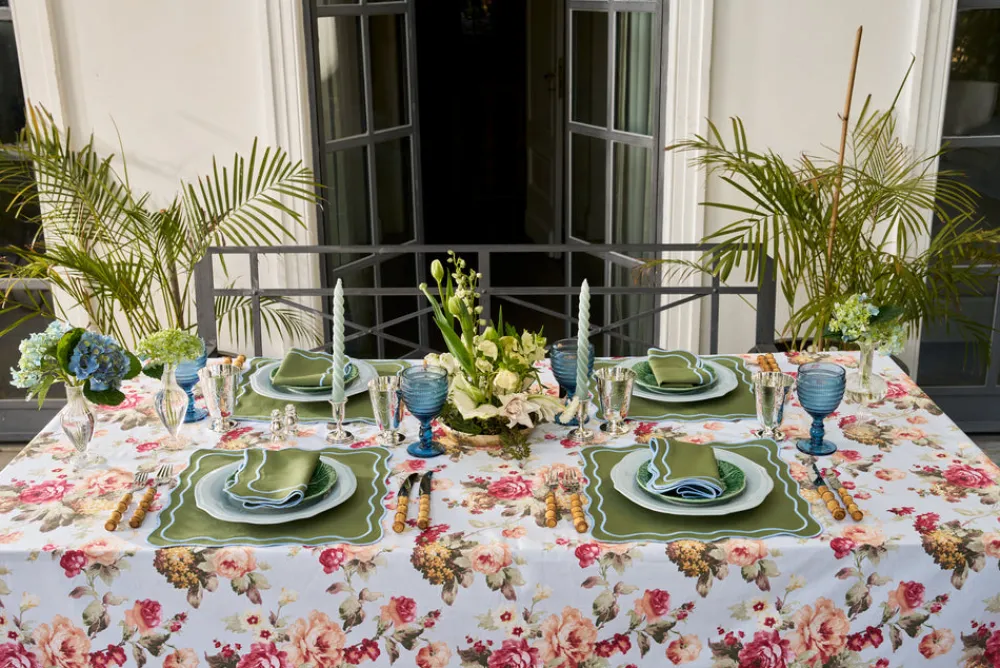 To enliven your tabletop and the conversation, look to Loulou La Dune. Based in Istanbul, Aylin Cinarli Duna’s architectural background provides the outlook for the brand’s luxury linens and beautiful hand embroidery. Her embrace of unique artisanship, and only the finest materials, adds elements refined craftsmanship to your bedroom, bathroom, kitchen and living spaces. Ideal for warm weather family gatherings and dinner parties, the Wild Roses Tablecloth in Blue lights up any room, or al fresco table, with an explosion of florals on a delicate blue background.