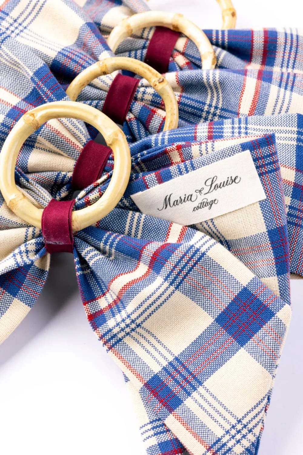 Maria Louise Cottage is a cozy haven steeped in history and charm. Once a humble milk room from the early 1900s, this space has been lovingly transformed into a workshop of creativity and craftsmanship. Every item here is meticulously handmade, infused with care and attention to detail. We use vintage fabrics, each carrying its own story, which means many of our creations are one-of-a-kind treasures available in limited quantities. The Marseille Indigo Plaid Napkin Rings in Blue, Set of 4 are made from vintage fabric in a classic indigo plaid, these napkin rings offer a blend of rustic charm and refined craftsmanship. Their deep blue tones and timeless design create a cozy, heritage-inspired accent ideal for everyday meals or special occasions.