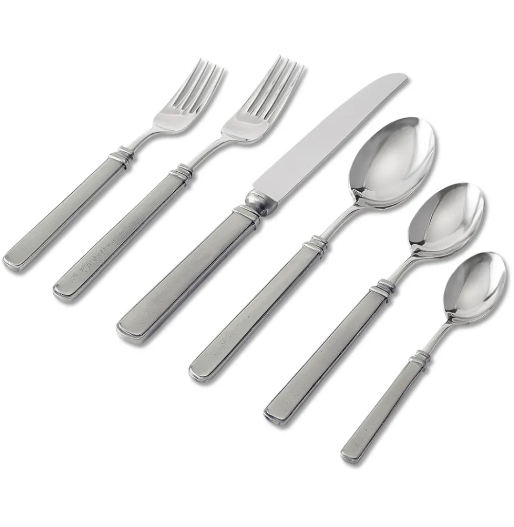 Salad Fork, Dinner Fork, Dinner Knife, Soup and Teaspoon and the Dessert Spoon. 18/10 stainless steel working ends, without the use of any adhesives. The knives feature forged stainless steel blade. Every piece of Match pewter is marked with the manufacturer’s “M” insignia as well as the mark of the tin content of “95.” Handmade in Northern Italy.