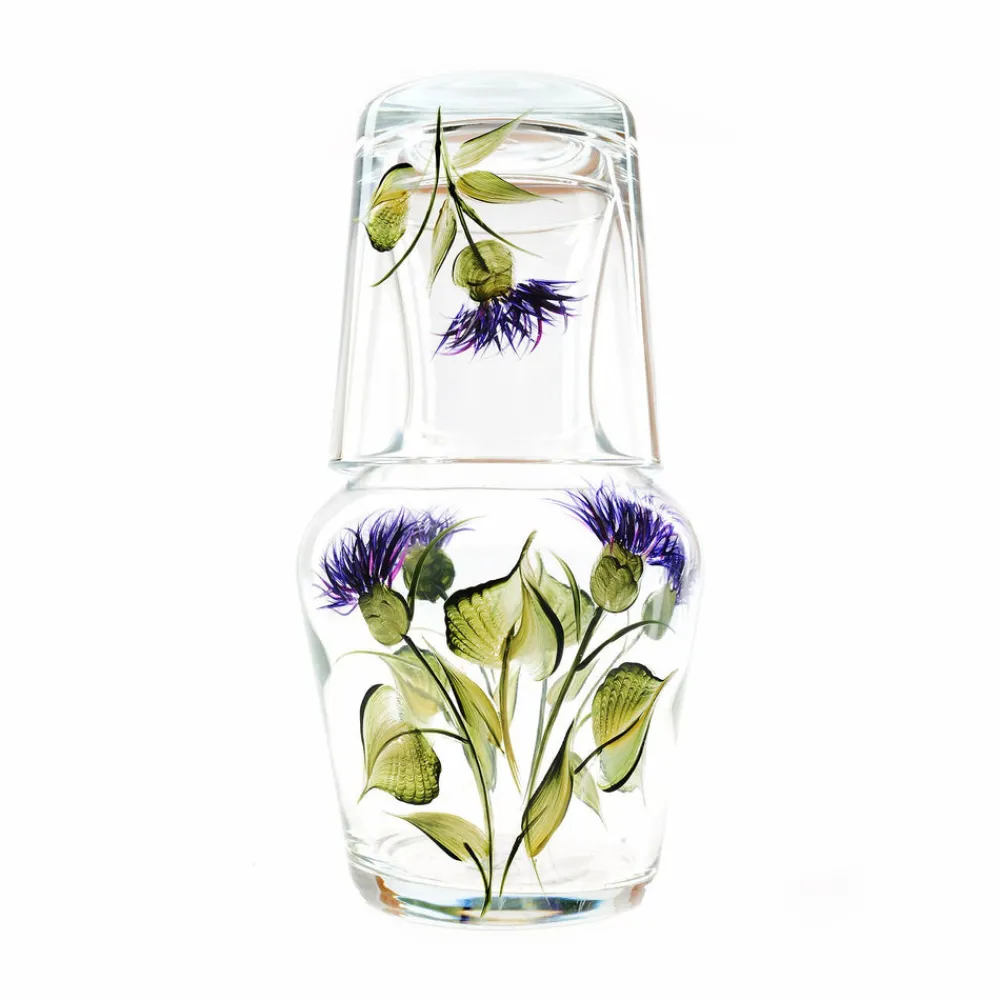 From her flagship in the Highlands of Scotland, Petra Polumbo draws from her Lebanese and Scottish heritage to form the colorful designs and unique aesthetic of her timeless homewares. Bursting with curves and florals, Petra Palumbo’s carafe and tumbler add romantic touches, while keeping your water fresh all night and providing the finest conduit for your refreshment. The Plume Thistle Carafe And Tumbler features a plume thistle in all is mauve glory.