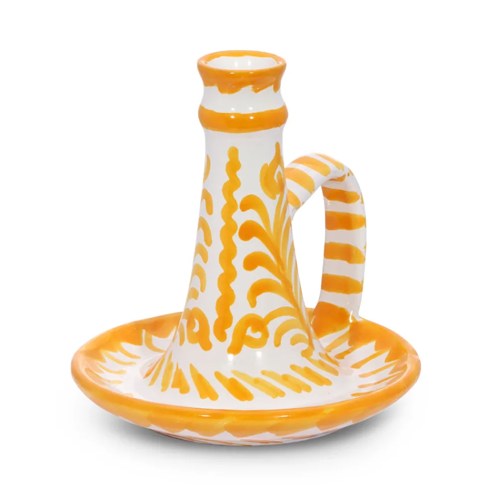 Using ancient techniques and Lebrillo motifs that date back to the 16th century, each Pomelo Casa piece is handmade and hand-painted by only five small, family-run workshops in Granada. For the first time, they are being exported outside of Europe, so that the gorgeous, simple, timeless patterns of Southern Spain can be shared with the world, making it brighter in the process. The Casa Amarilla Candlestick with Hand-Painted Designs features a delightful pattern, in bright, earthy orange. Perfect for an evening meal, indoors or out. Because of their handmade nature, each piece may have a slight variation in pattern as a result. Minor imperfections are not considered flaws but instead add to the authenticity and charm of these beautiful home goods.
