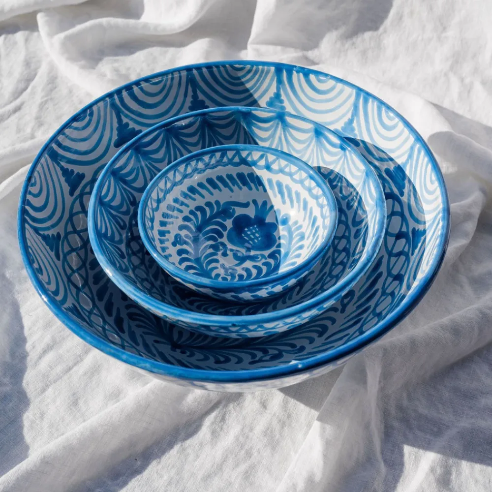 Using ancient techniques and Lebrillo motifs that date back to the 16th century, each Pomelo Casa piece is handmade and hand-painted by only five small, family-run workshops in Granada. For the first time, they are being exported outside of Europe, so that the gorgeous, simple, timeless patterns of Southern Spain can be shared with the world, making it brighter in the process. The Casa Celeste Mini Bowl with Hand-Painted Designs features pastoral figures—birds or pomegranates—and a delightful trim, in calming sky blue. Perfect for granola and yogurt or olives or pesto. Because of their handmade nature, each piece may have a slight variation in pattern as a result. Minor imperfections are not considered flaws but instead add to the authenticity and charm of these beautiful home goods.
