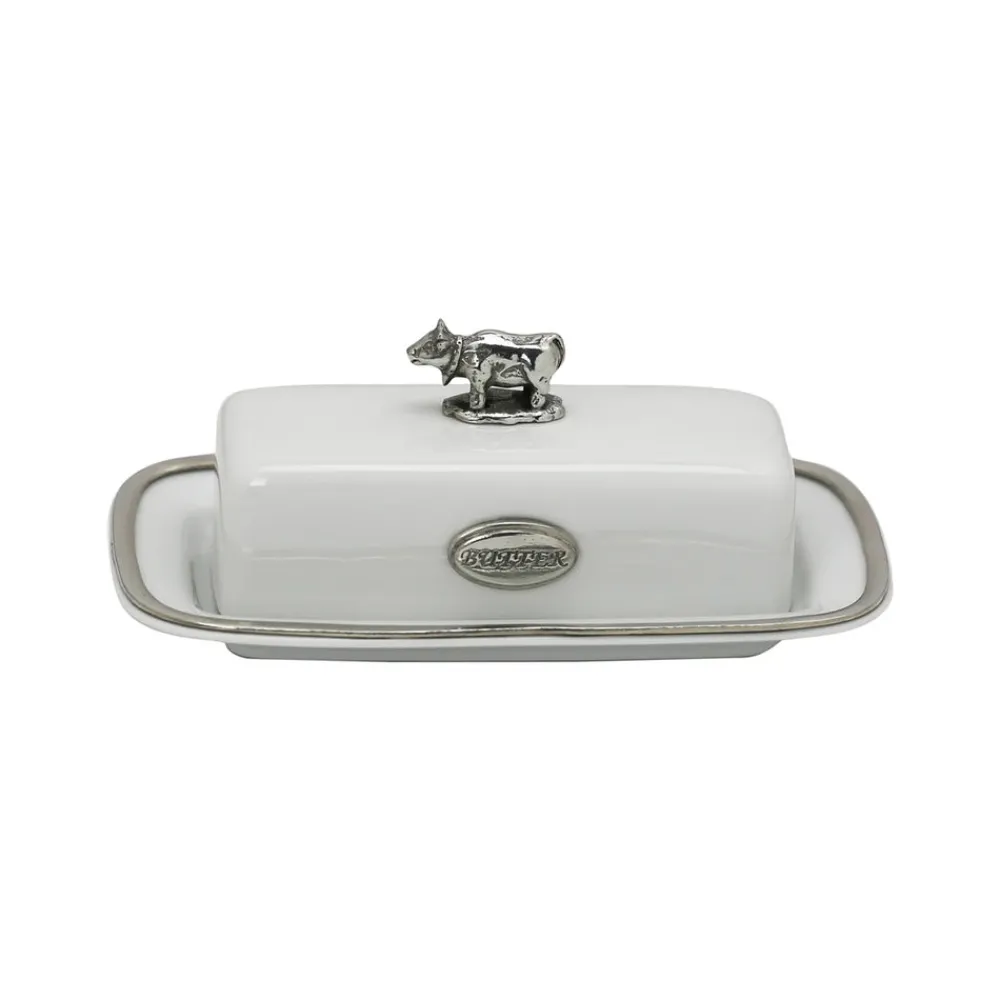 Pewter and porcelain. Fits stand single butter stick. Made in the USA. This item arrives in a gift box.