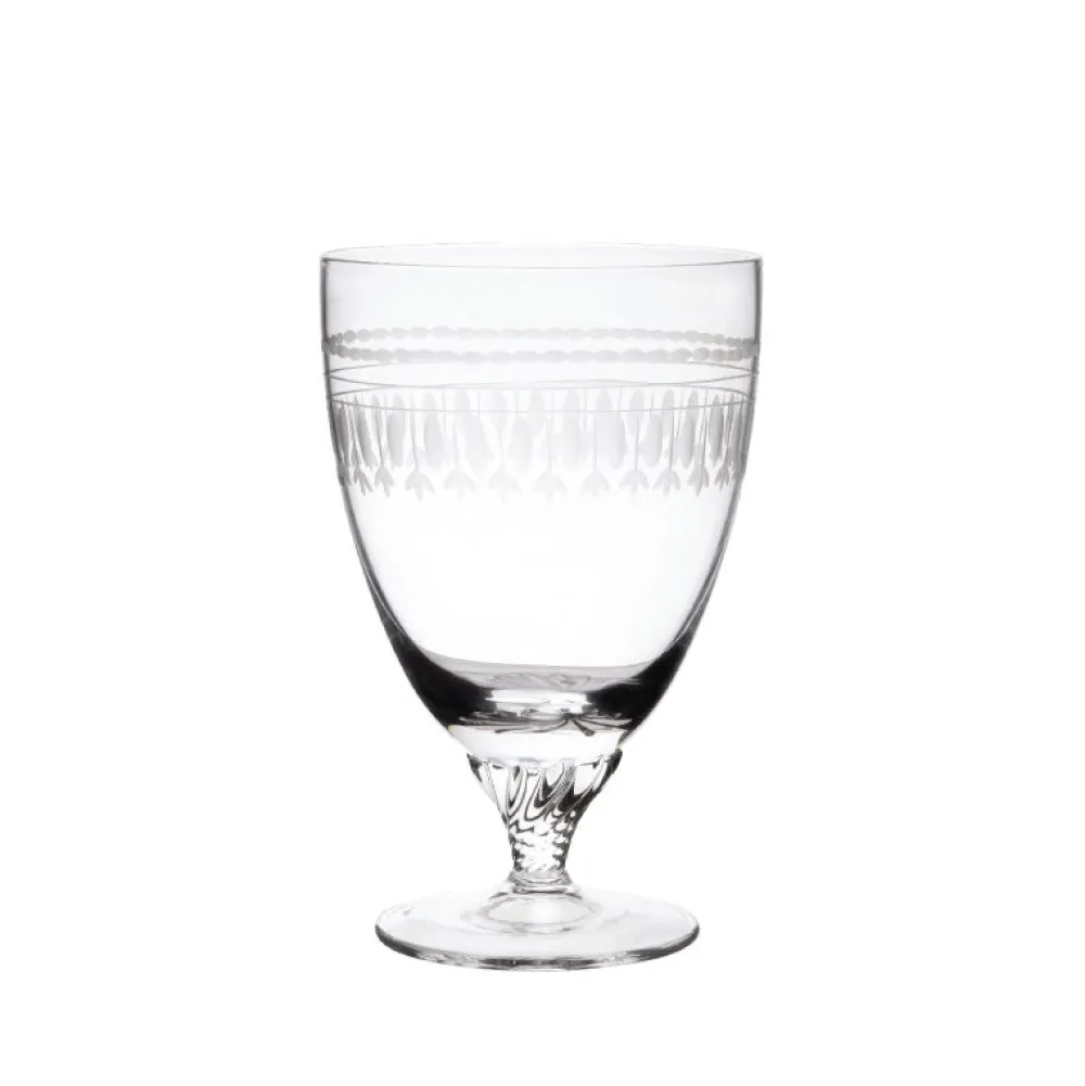 Fine crystal. Each glass has been hand-blown and hand-engraved, with a short twisted stem.