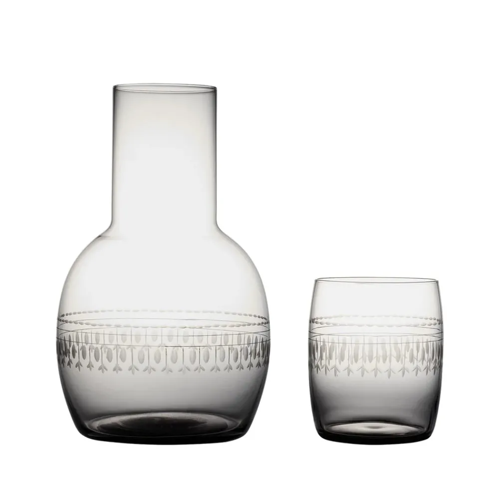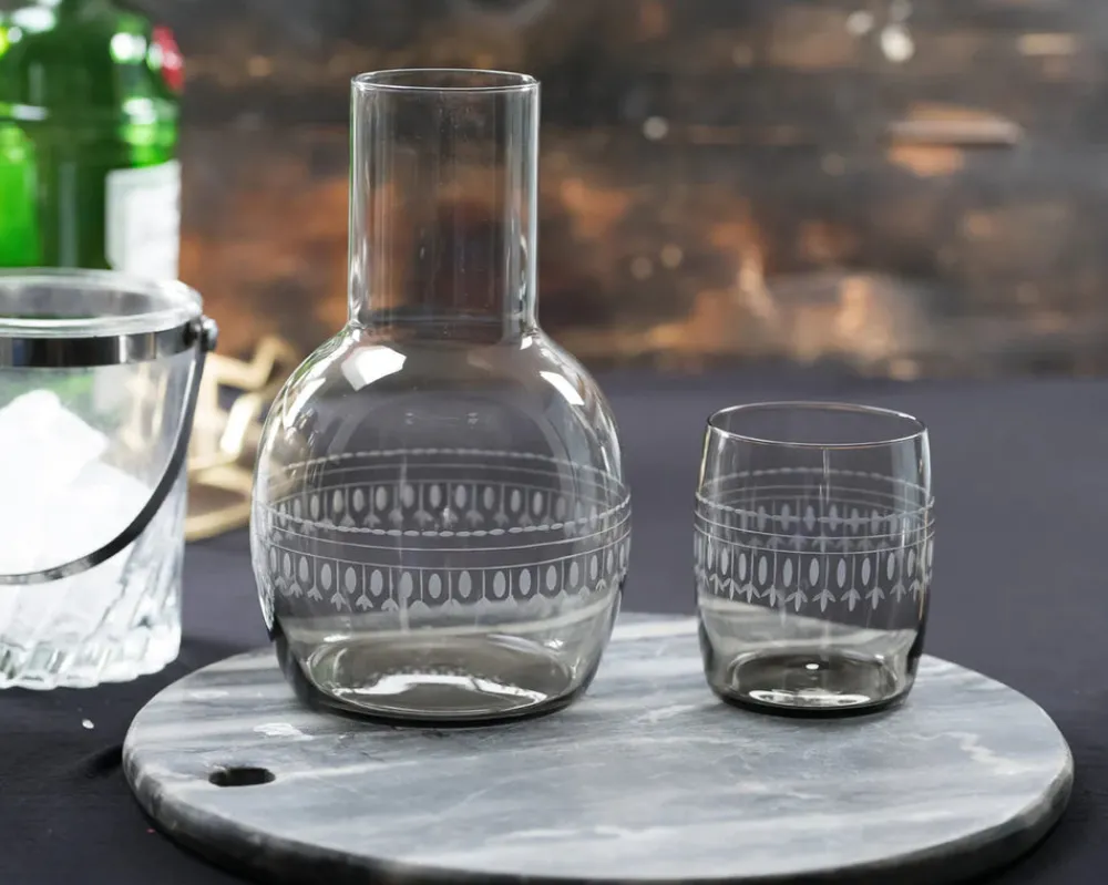 Founded in 2015 by former antique dealers Camilla and Henry Davies, London-based The Vintage List reproduces the timeless glassware the Davies once found in English antique markets. Their hand-blown, engraved glasses turn any cocktail hour or meal into a special occasion, and yet these glasses are designed to be used every day, and sit beautifully in any contemporary setting. The smoky glass series is colored in a furnace, not painted, to maintain their color. Hand-blown and hand-decorated with a band of delicate ovals, A Smoky Crystal Carafe Set With Ovals Design is accompanied by a matching glass, which is dishwasher safe.