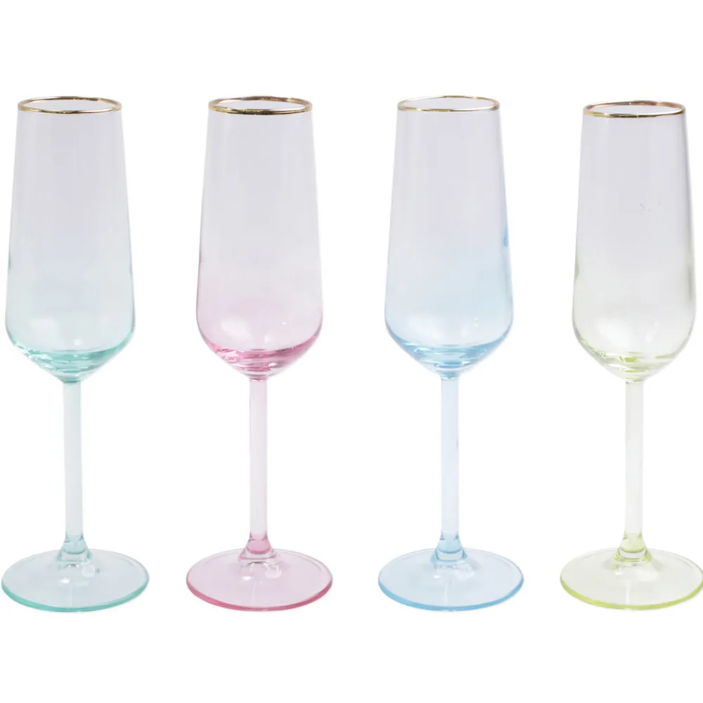 Inspired by Italian lifestyle, history, and culture, VIETRI uses the highest-quality clays from the soil of Italy’s countryside to produce beautiful, everyday items for your home. Hand-painted details, quality glazes, and fine craftsmanship help you savor the moments spent at your table and the company of those who join it. The Rainbow Champagne Flutes add sparkle to any setting with a gilded gold rim and colored glass that refracts light.