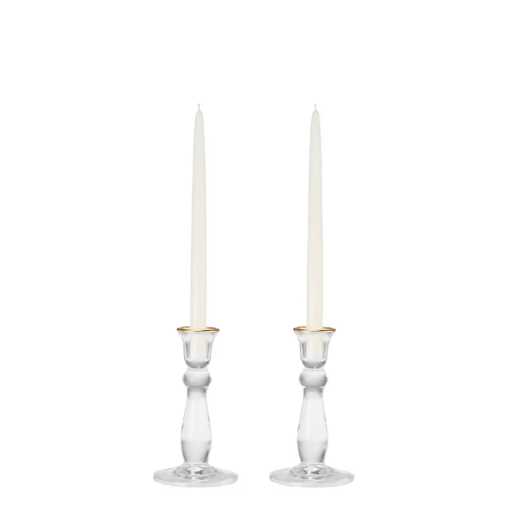 Effortless, beautiful living is what’s important to Aerin Lauder. That ease and refinement shines through in every detail of her collections of beauty products, home decor, and fashion accessories. Crafted in a classic shape, the Sancia Tall Taper Candleholders in Gold Rim, Set of 2 is an elegant addition to a table setting. Each candleholder is enhanced with a hand-painted gold rim creating a soft, warm glow.