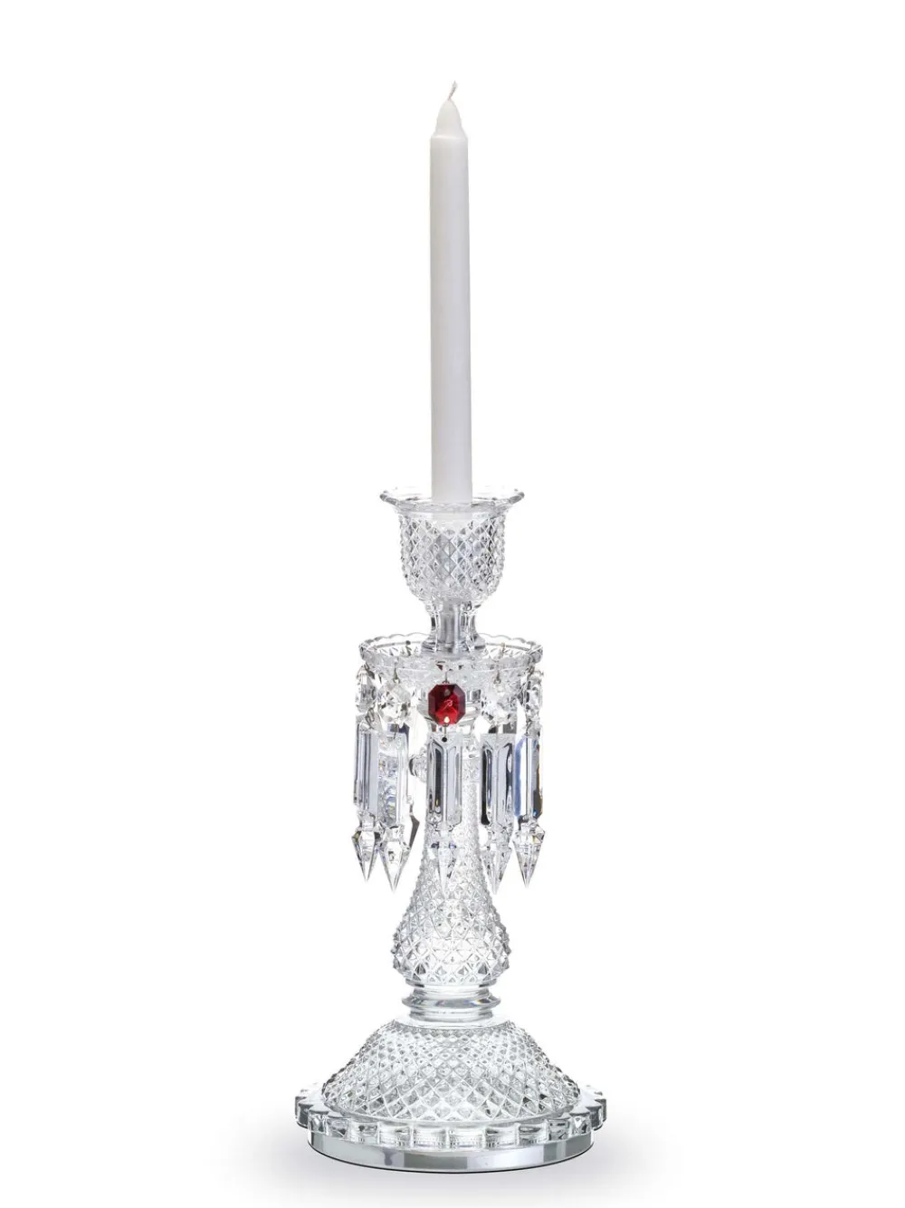 Founded in 1765, Baccarat is renowned throughout the world for the remarkable quality and timeless design of its glassware. With master blowers, cutters, engravers, and gilders honing their techniques to perfection, Baccarat introduces you to the finest crystal and an entire world of excellence. Inspired by their classic Zenith chandelier, the Baccarat Zenith Candelabra is elegant and sophisticated, characterized by diamond cuts, hanging darts and red crystal ornament, discreetly hung amidst the translucent clear crystal.