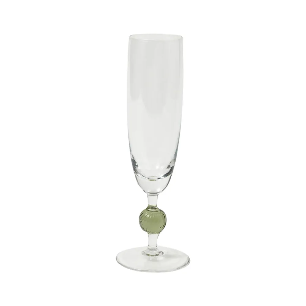 Founded by Martina Mondadori and Christoph Radl in 2014, Cabana Magazine inspires a new generation of globetrotters on their journey through collecting, colors, and fabrics. The Cabana homewares collection brings its pages to life while evoking a distinctive Italian mood. The Demetra Glassware represents Cabana’s first complete collection of stemware, and the Demetra Flute Glass is simple elegance with an elongated silhouette punctuated with a green glass bauble.