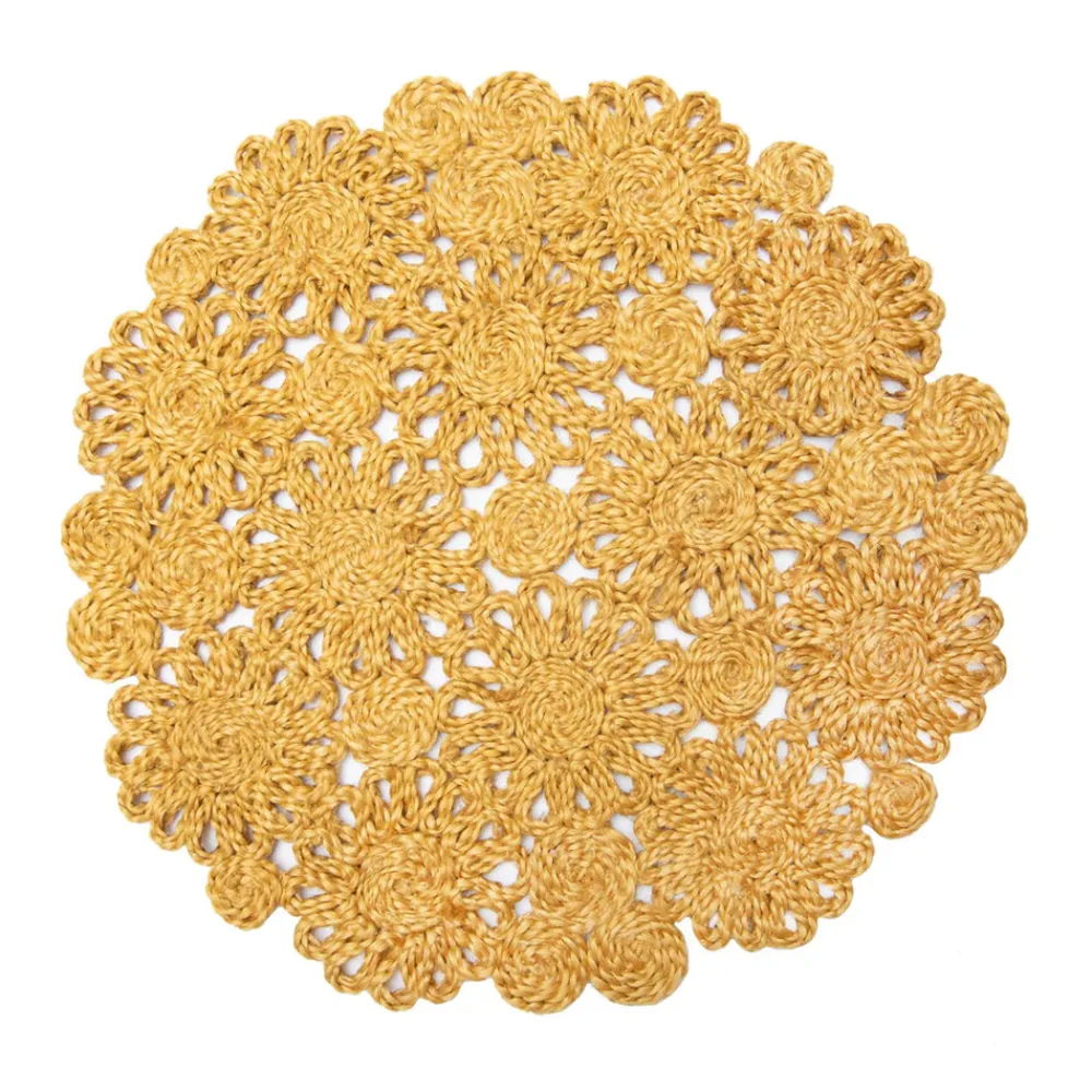 Inspired by stylistic trends from around the world, Caravan’s home accents embody an aesthetic that is both unique and unexpected, bringing everyday beauty and sophisticated simplicity to your home. The Daisy Jute 15″ Round Placemat in Mustard, Set of 4, manages to be beautiful, sophisticated, and simple all at once. Handwoven from natural jute fiber, the scalloped floral design will enliven any table.