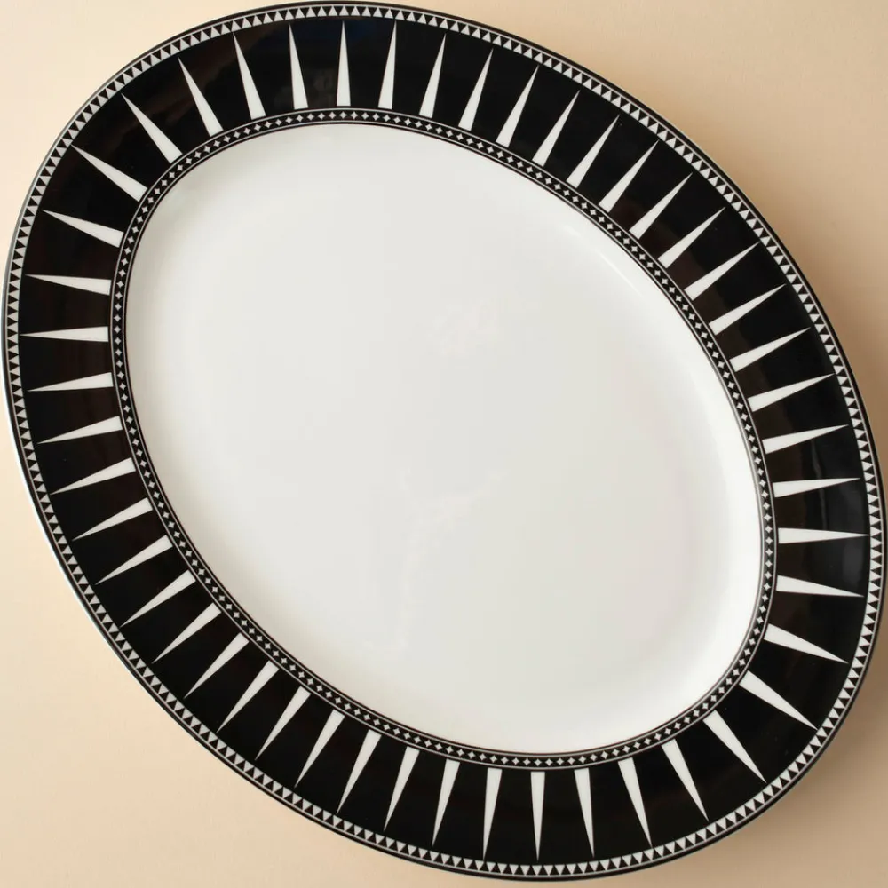 Caskata makes dinnerware for those who love to entertain. That joie de vivre and celebratory atmosphere makes its way into each piece of the brand’s blend of classic and contemporary designs, recognizable by their creative patterns, enduring quality, and light touch. The Marrakech collection draws its inspiration from the vibrant and ancient graphic patterns found throughout Morocco, reimagine in Art Deco forms. The Marrakech Large Oval Rimmed Platter provides an ideally exotic, yet recognizable, serving platter for your favorite mains, be they pastas, grain salads, meats or tagine.