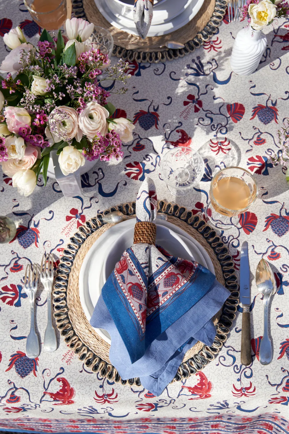Idyllic landscapes, sumptuous colors, and the vibrant beauty of Southern France describes Couleur Nature. This brand of hand-painted table linens aims to bring a Provençal sense of effortlessness, rich culture, and joie de vivre to your life and home—no matter where you live. With its curling vines and flowers, the rich harvest tones of the Fleur des Indes Napkins in Blue & Red, Set of 6 are exotic and sophisticated. Combining Eastern motifs with classic French styling, these table linens runners are ideal for formal or festive events. Designed exclusively for Couleur Nature by Parisian artist Bruno Lamy.