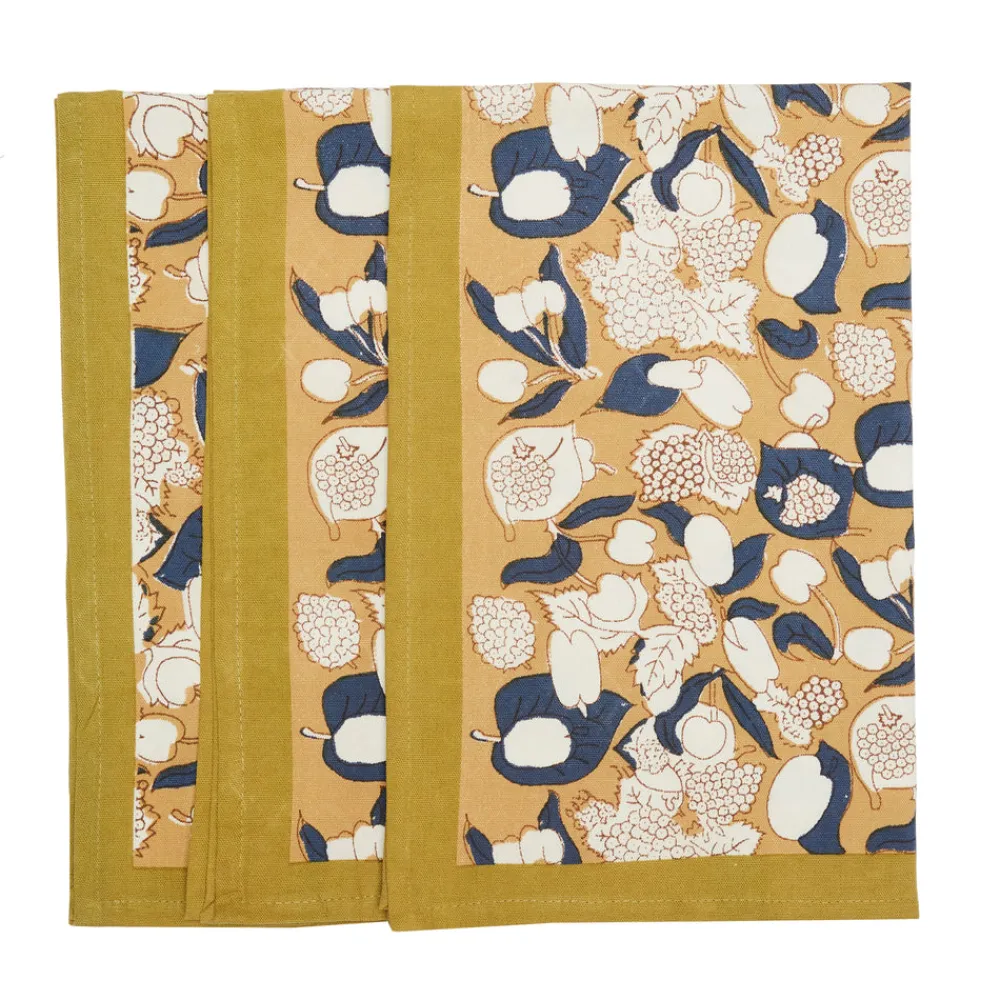 Idyllic landscapes, sumptuous colors, and the vibrant beauty of Southern France describes Couleur Nature. This brand of hand-painted table linens aims to bring a Provençal sense of effortlessness, rich culture, and joie de vivre to your life and home—no matter where you live. With a nod to the lush splendor of Provencal forests, the Forest Harvest Tea Towels in Mustard & Blue, Set of 3 features an array of sumptuous fruit amidst richly entwined foliage. The twirling vines and blossoming imagery make a pleasing backdrop to any meal, and this high-quality linen is hand-printed by skilled artisans using a time-honored technique, resulting in a singular piece of craftsmanship. You can pair with other linens from the Forest Harvest collection, or add contrast with solid colors.