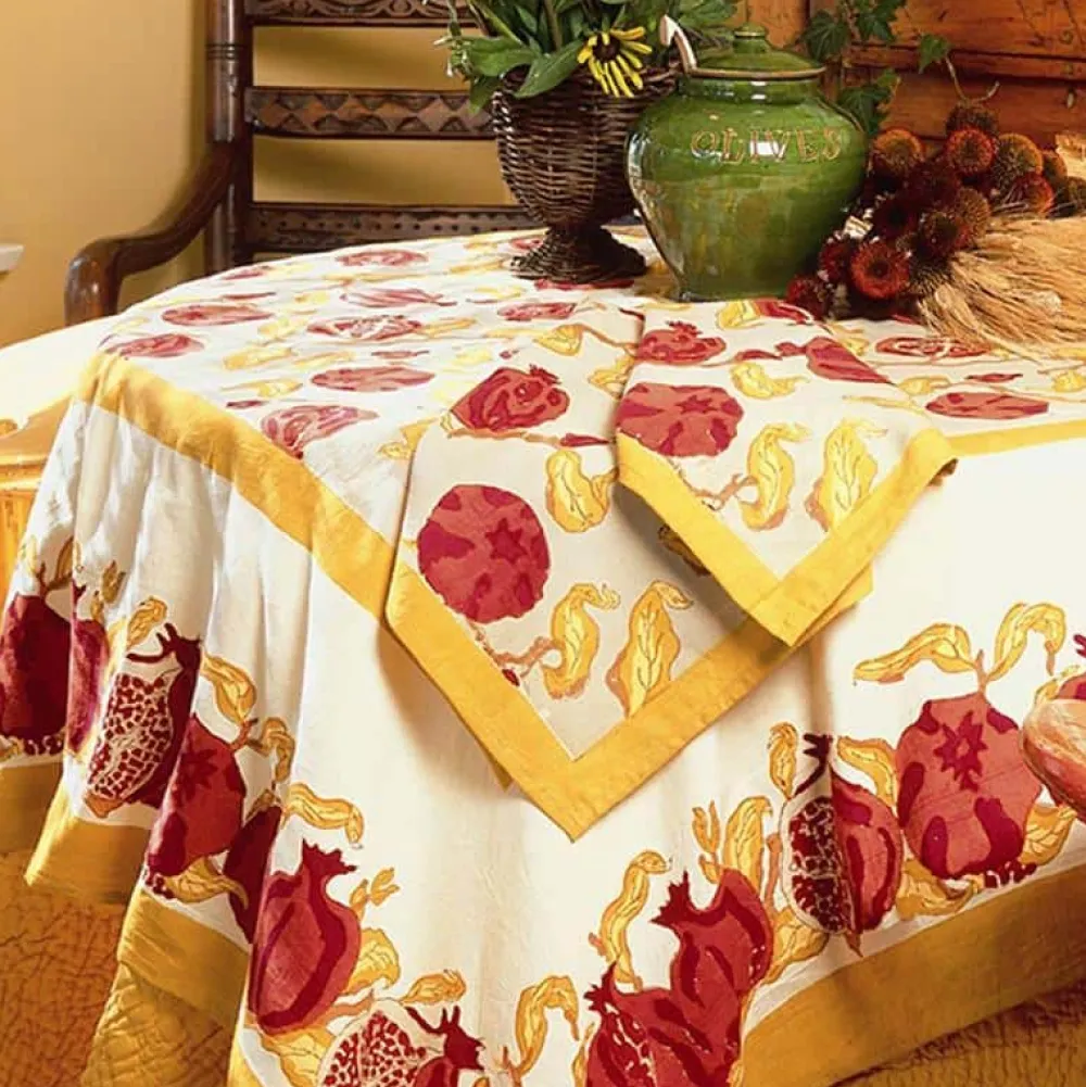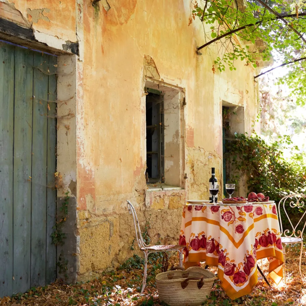 Idyllic landscapes, sumptuous colors, and the vibrant beauty of Southern France describes Couleur Nature. This brand of hand-painted table linens aims to bring a Provençal sense of effortlessness, rich culture, and joie de vivre to your life and home—no matter where you live. The French Tablecloth Pomegranate ruby red tones and bright, citrine yellows. Designed in a lively pattern that brightens up any space, this high-quality piece is a must-have for dine-in memories. An elegant addition to any tablescape.