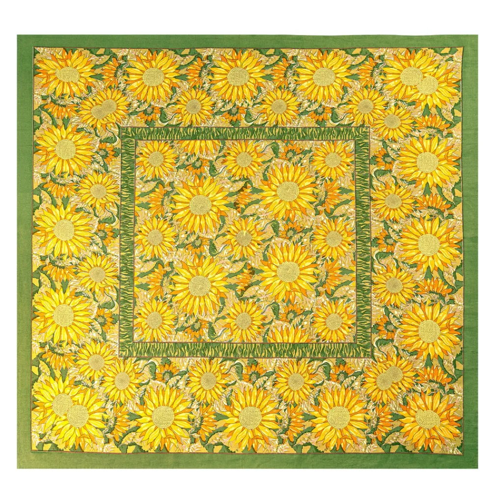 Idyllic landscapes, sumptuous colors, and the vibrant beauty of Southern France describes Couleur Nature. This brand of hand-painted table linens aims to bring a Provençal sense of effortlessness, rich culture, and joie de vivre to your life and home—no matter where you live. The French Tablecloth Sunflower in Yellow and Green features a countryside design renowned for its lush, rolling vistas and landscapes where vast fields of sunflowers bloom in summer. Reflecting the glow of warmer weather and sunny days, this high-quality piece is a must-have for dine-in memories. An elegant addition to any tablescape.