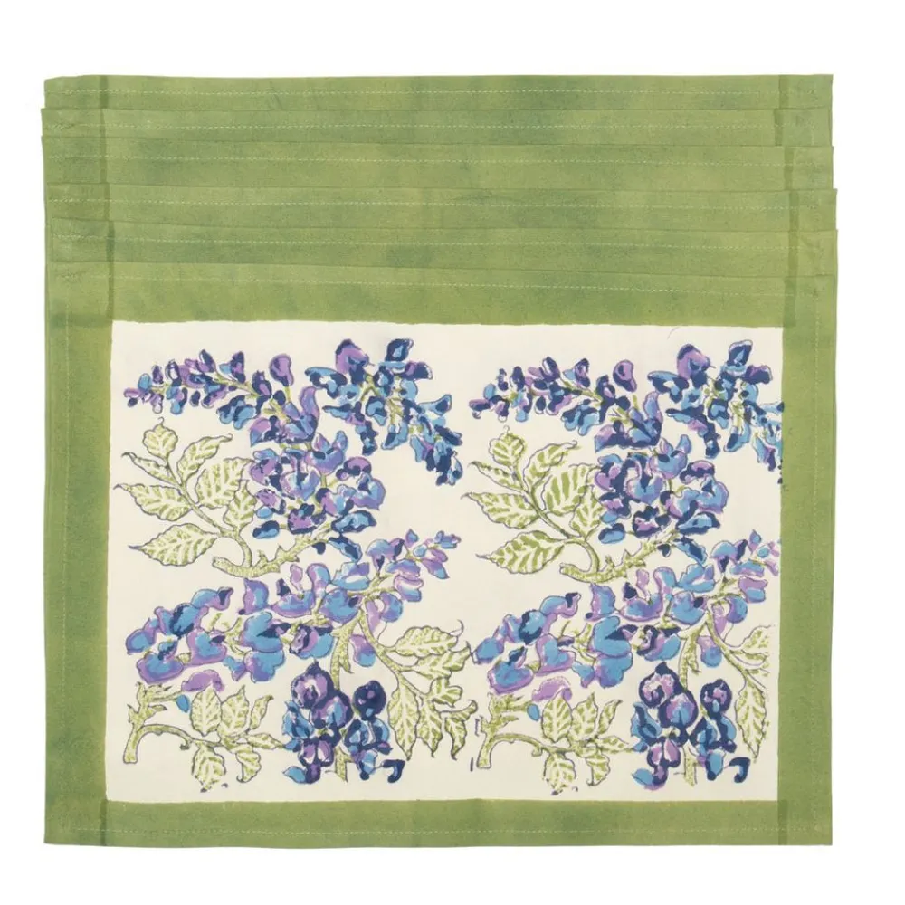 Idyllic landscapes, sumptuous colors, and the vibrant beauty of Southern France describes Couleur Nature. This brand of hand-painted table linens aims to bring a Provençal sense of effortlessness, rich culture, and joie de vivre to your life and home—no matter where you live. The Wisteria Mars in Blue & Green, Set of 6 features olive green vines with delicate pendant-like blooms. The ivory background with its cascading red and pink-tinged flowers create a beautiful landscape for your delicacies. Dine-in style amidst memories of gorgeously perfumed flower clusters. This elegant piece is a tasteful essential in every linen collection.