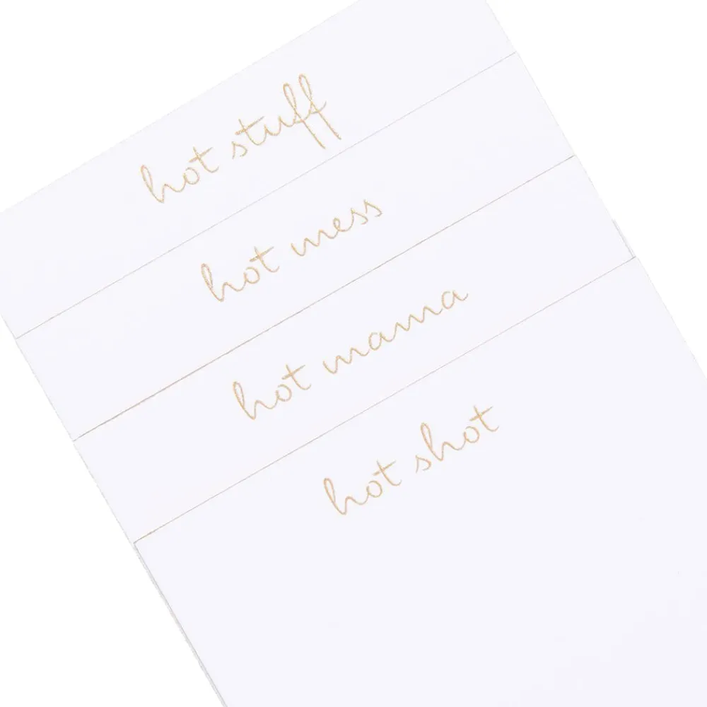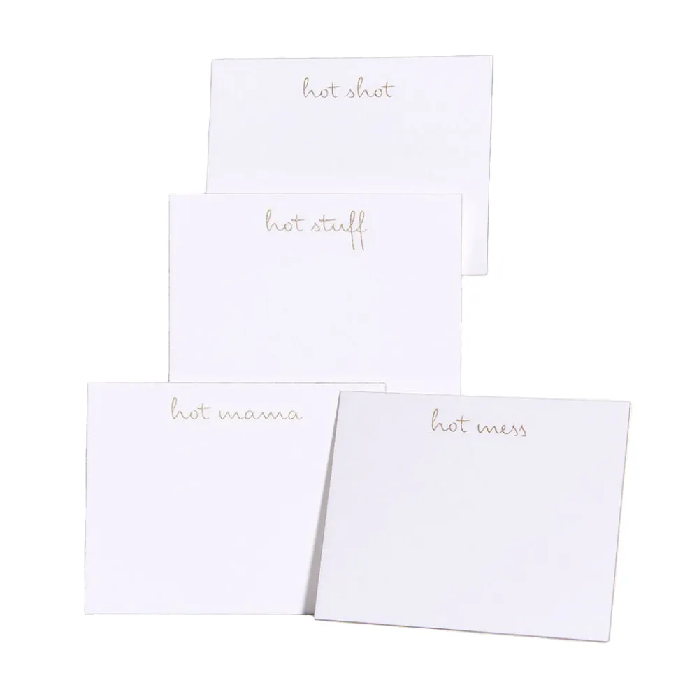 24 cards in every set. Bright white, heavyweight flat cards. Gold ink engraving and gold-painted edge. 6 of each saying in every set: Hot Stuff, Hot Mess, Hot Shot, and Hot Mama. Made in New York City.