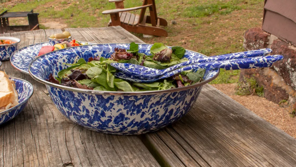 Founder Peggy Hedgpeth created Golden Rabbit to make everyday entertaining feel effortless. With functionality, safety, and durability at the forefront, the brand’s distinctive designs—from traditional enamelware to kid-friendly sets—set it apart in kitchens and dining rooms the world over. Coated porcelain enamel and trimmed with stainless steel to prevent chipping, the Catering Bowl in Cobalt Swirl is a colorful, creative way to serve everything from salads, to grains to soup to desserts.