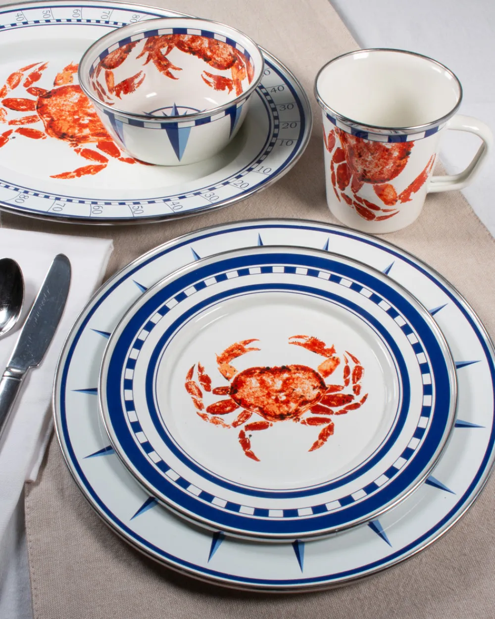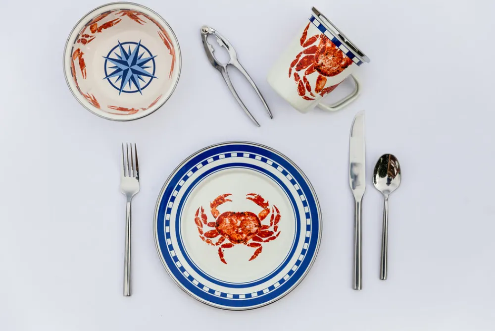Founder Peggy Hedgpeth created Golden Rabbit to make everyday entertaining feel effortless. With functionality, safety, and durability at the forefront, the brand’s distinctive designs—from traditional enamelware to kid-friendly sets—set it apart in kitchens and dining rooms the world over. Coated porcelain enamel and trimmed with stainless steel to prevent chipping, the Dinner Plates in Crab House adds a dash of maritime style and sophistication to your service of meats off the grill, fresh veggies, salads, or any of your favorite mains.