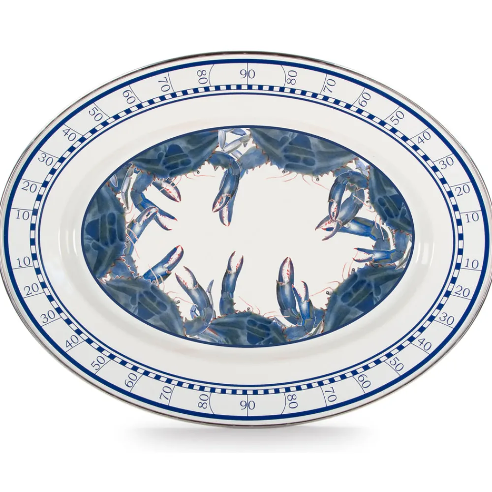 Blue Crab 12 x 16 inch Oval Platter ¥ Oven & Stovetop Safe ¥ Hardened Enamel Surface ¥ Dishwasher Safe ¥ Non-ToxicThis enamelware is made of carbon steel coated with a porcelain enamel and trimmed in stainless steel. There will be variations in the shading of colors and pattern formations which are the results of the hand-dipped process.These enamelware pieces add the perfect dash of style and sophistication to your meals. YouÕll be sure to excite appetites and eyes with our selection of enamelware pails, stock pots, platters and more. As always, these pieces are built to maintain their artistic appeal and function for many years to come.Ê