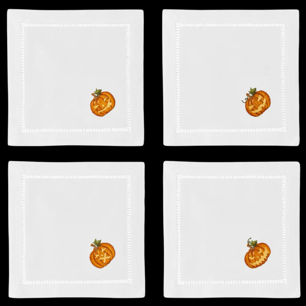 Founded in 2012, Henry Handwork brings joy to the everyday with handmade textiles for the home. Placing tradition and quality at the forefront, the brand resurrects the fading craft of hand-embroidery and needlework, embracing the heritage of finely-wrought European linens. The Carved Pumpkins Mixed Cocktail Set includes four white, hand-embroidered, 100% cotton squares, each finished and hemstitched by hand. These napkins will add a touch of halloween charm to any home.