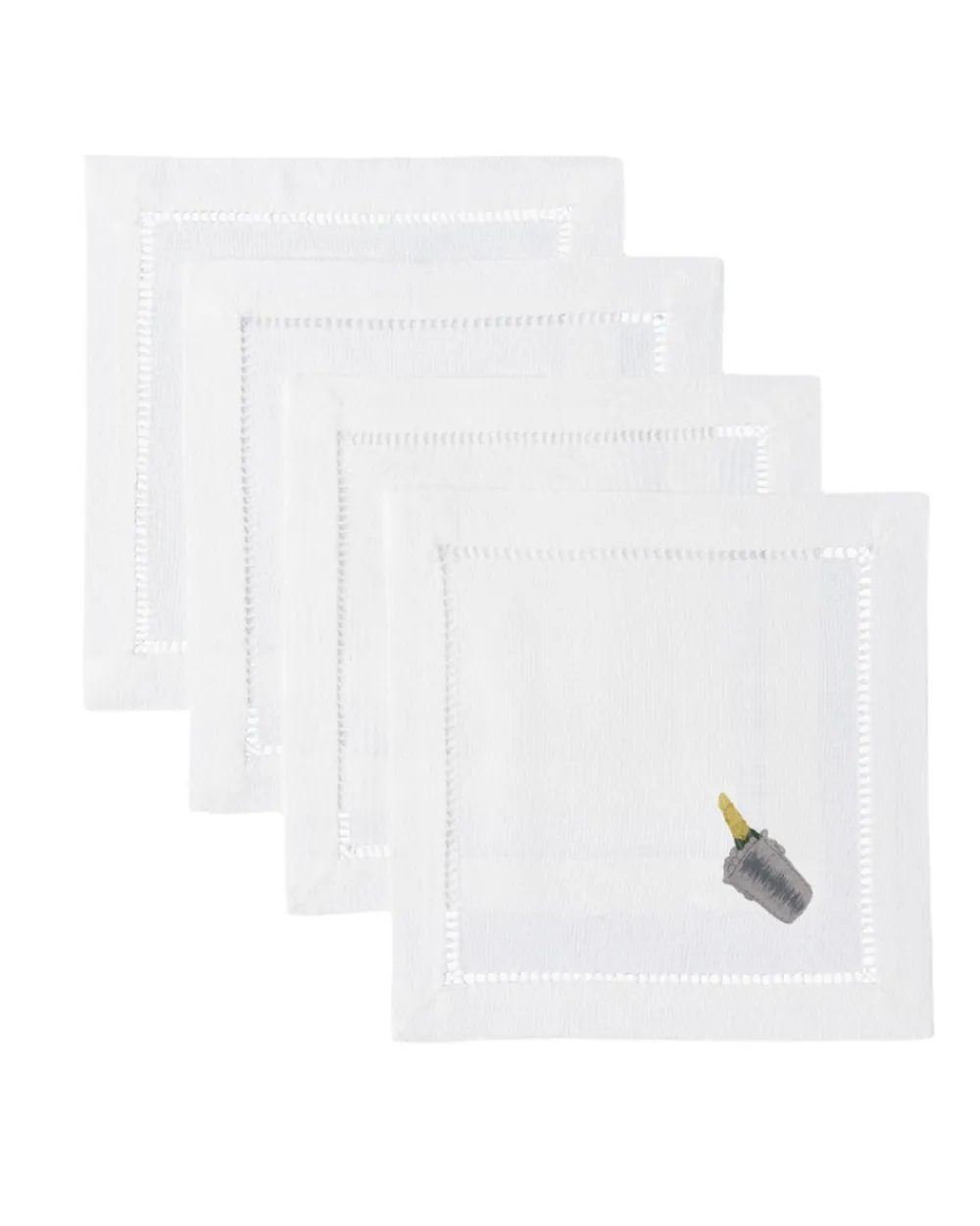 Hand-embroidered cocktail napkins on 100% cotton. Finished and hemstitched by hand. Set of 4 cocktail napkins. Packaged with a cardboard insert. Tied with a white satin ribbon in a cello package. Imported. Ships from Portland, Oregon.