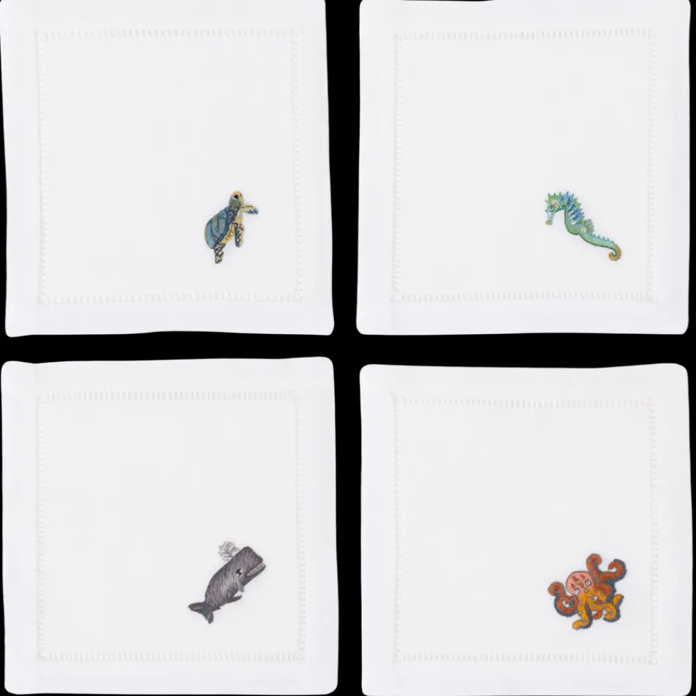 Founded in 2012, Henry Handwork brings joy to the everyday with handmade textiles for the home. Placing tradition and quality at the forefront, the brand resurrects the fading craft of hand-embroidery and needlework, embracing the heritage of finely-wrought European linens. The Sea Life Mixed Cocktail Napkin Set includes four white, hand-embroidered, 100% cotton squares, each finished and hemstitched by hand. These napkins will add a touch of marine habitat charm to any home.