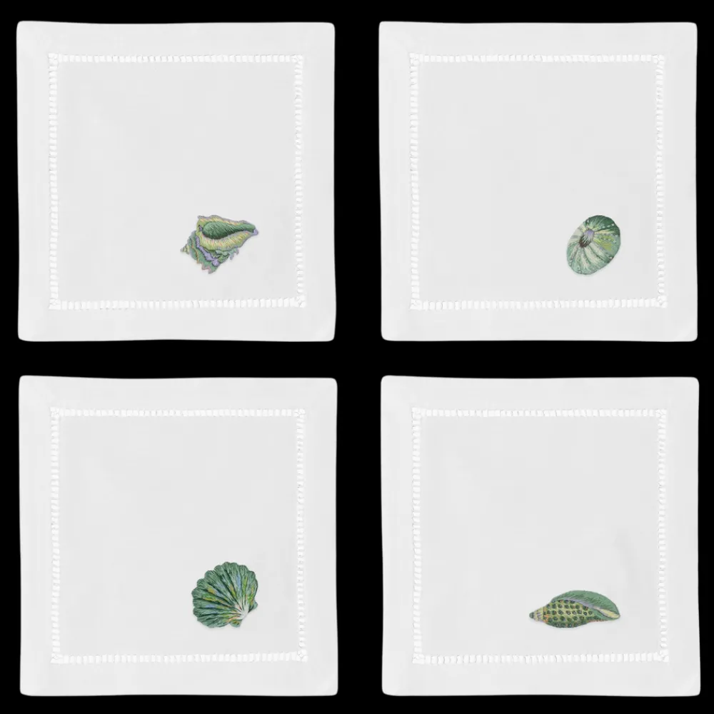 Founded in 2012, Henry Handwork brings joy to the everyday with handmade textiles for the home. Placing tradition and quality at the forefront, the brand resurrects the fading craft of hand-embroidery and needlework, embracing the heritage of finely-wrought European linens. The Shells Teal Cocktail Napkins includes four white, hand-embroidered, 100% cotton squares, each finished and hemstitched by hand. These napkins will add a touch of beachside charm to any home.