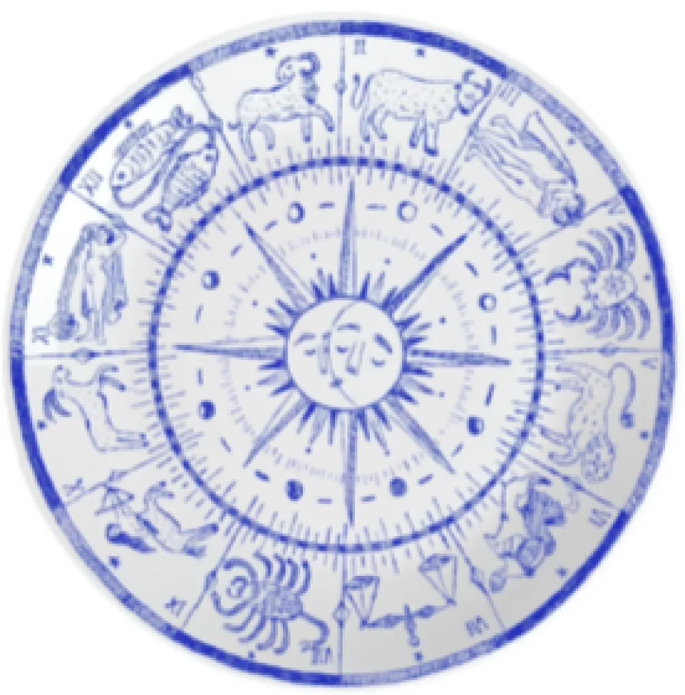 Silk screen-printed porcelain. Illustrated with twelve astrological signs. Lead-free glaze. Made in Portugal.