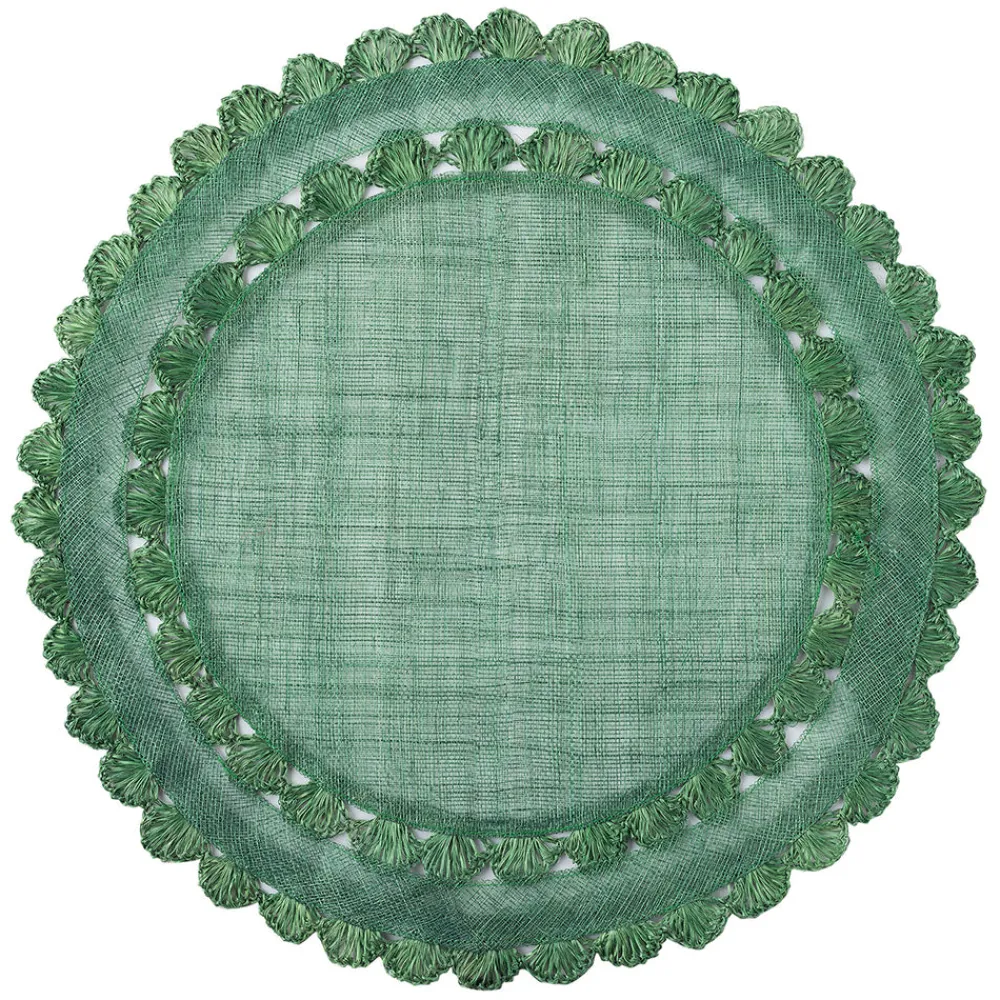 Natural fibers are woven in a rich green hue and embellished by a ruffled trim on the Isadora Evergreen Placemat to create a frame for table settings that is both relaxed and elegant.