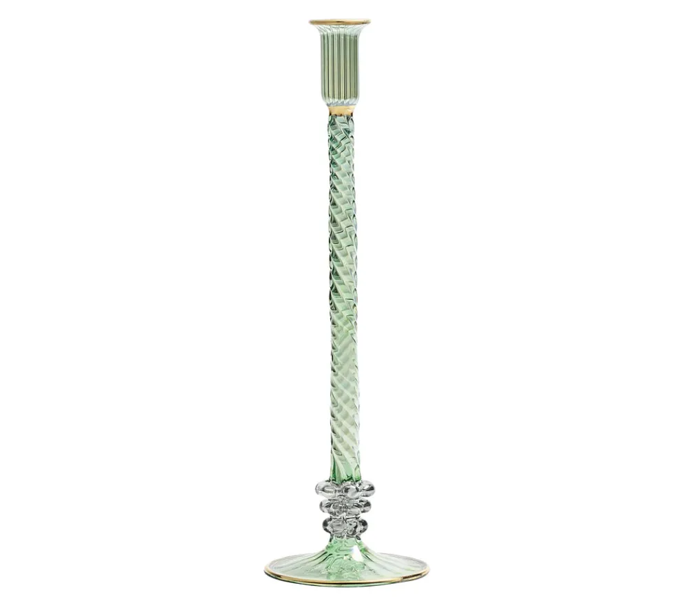 Kim Seybert designs artisan-made tabletop decor and luxury home accessories. Create a well-dressed dining look with the brand’s range of elegant tableware, placemats, runners, chargers, plates, napkins, flatware, and more. The mouth-blown, hand-molded glass Braid Candle Holder in Green stands tall, with an elongated braided stem atop a detailed base. Hand-applied color baked at high temperatures produces a gorgeous iridescent luster, accented by 18K gold bands. A refined candlestick that elevates any table setting.