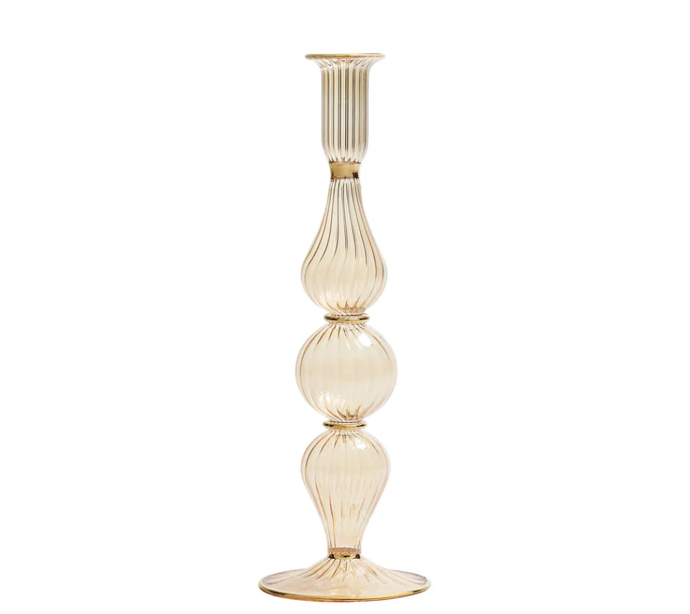 Kim Seybert designs artisan-made tabletop decor and luxury home accessories. Create a well-dressed dining look with the brand’s range of elegant tableware, placemats, runners, chargers, plates, napkins, flatware, and more. The mouth-blown, hand-molded glass Ripple Candle Holder in Champagne features a center globe amid two tapered globes. Hand-applied color baked at high temperatures produces an iridescent luster, accented by 18K gold trim. This sophisticated candlestick adds an understated elegance to any table. Expect shape, size and color variation due to their hand-crafted nature.